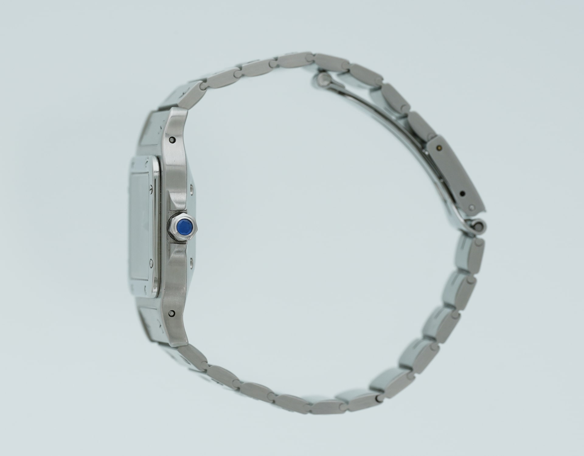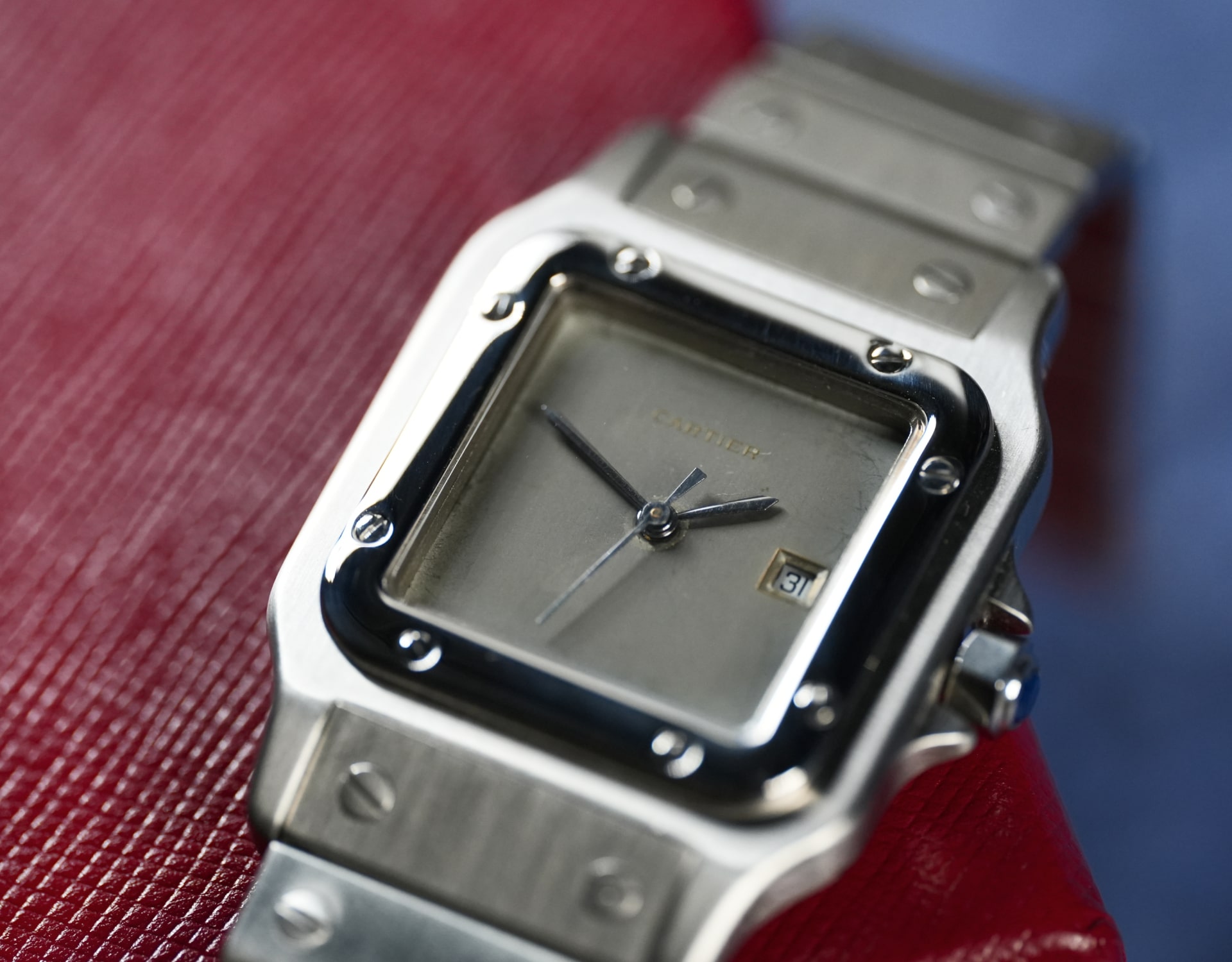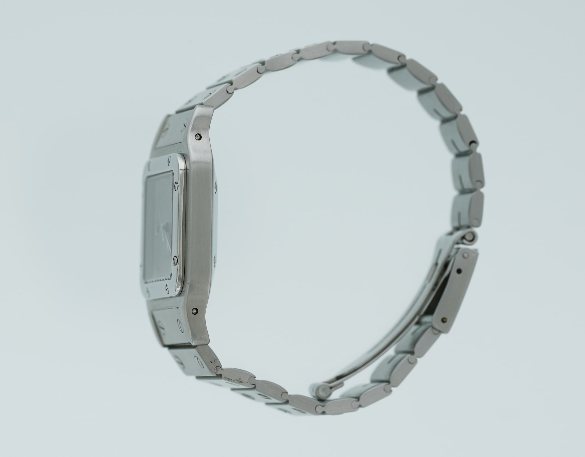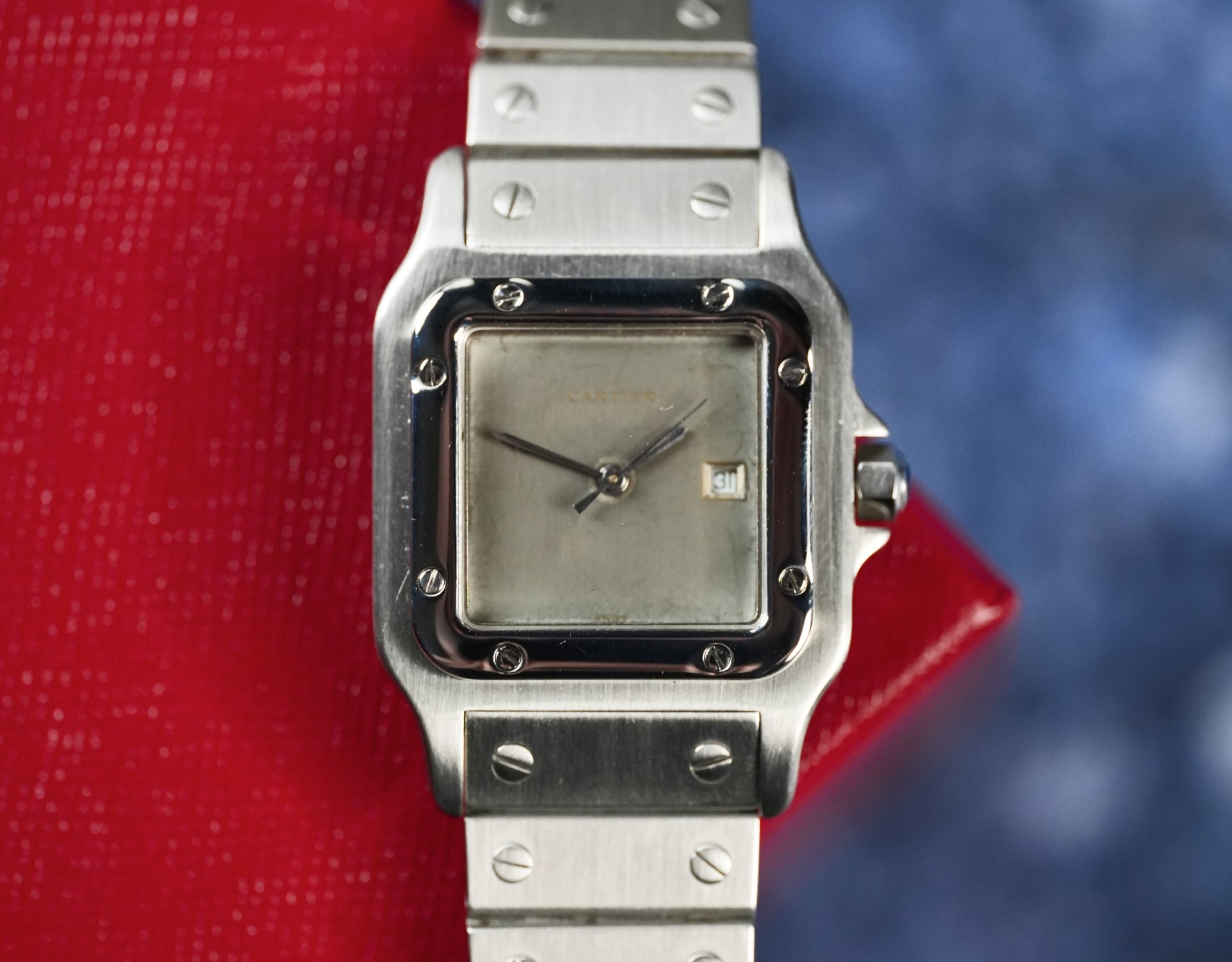 Cartier Santos Carrée ref. 2960 in stainless steel, Large Model (LM/GM), from the 1980s–1990s. Historical note: the late-’70s relaunch of the Santos established the squared Carrée case with exposed screws and an integrated bracelet—codes that came to define modern steel Cartier.