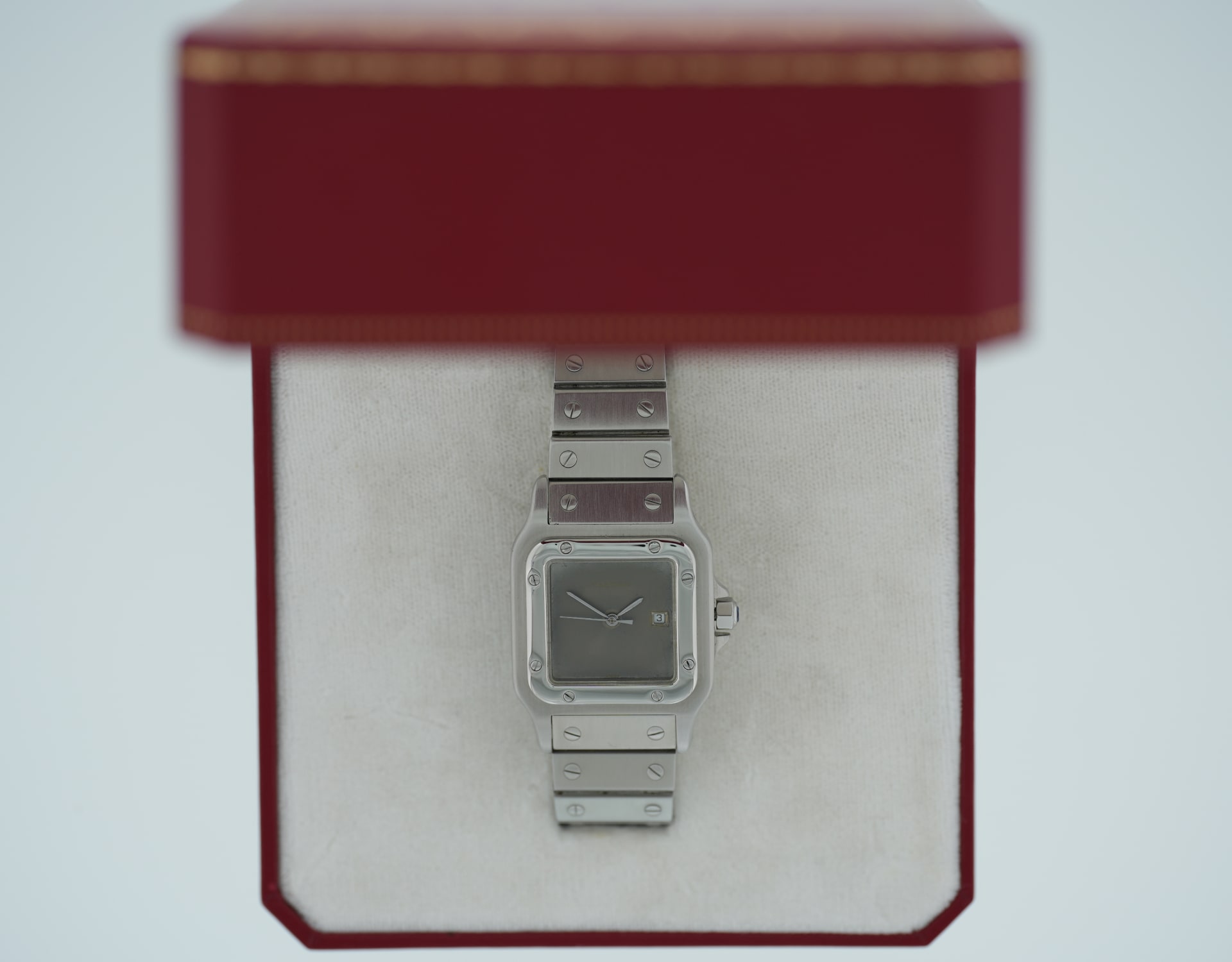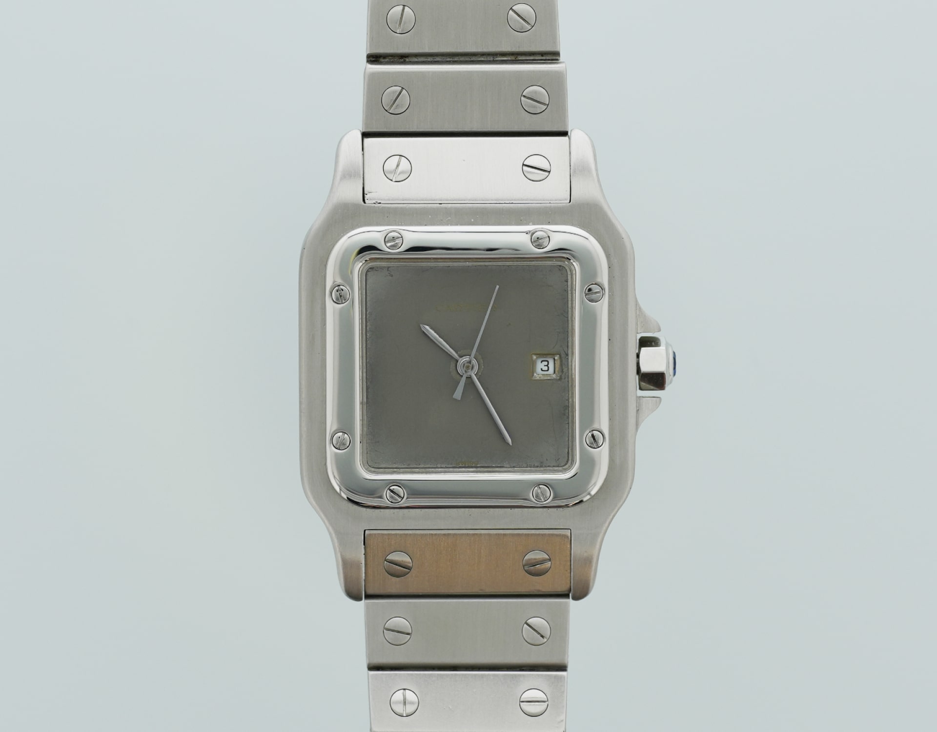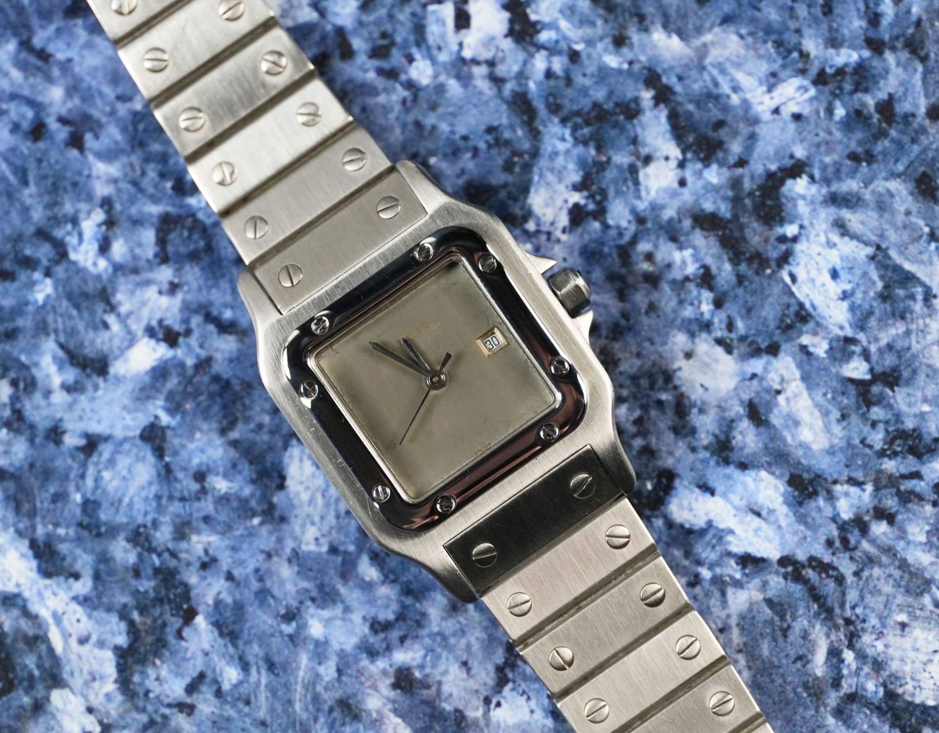 This example features a “Ghost” dial—a naturally matured slate-to-silver grey that gives the watch a calm, minimalist presence under the sapphire crystal. It wears slim and neatly under a cuff. Inside is Cartier’s automatic cal. 077. Fitted to its original integrated stainless-steel Cartier bracelet with Cartier-signed clasp. Note: the serial number has been polished off over time, something that can occur on vintage Santos cases.