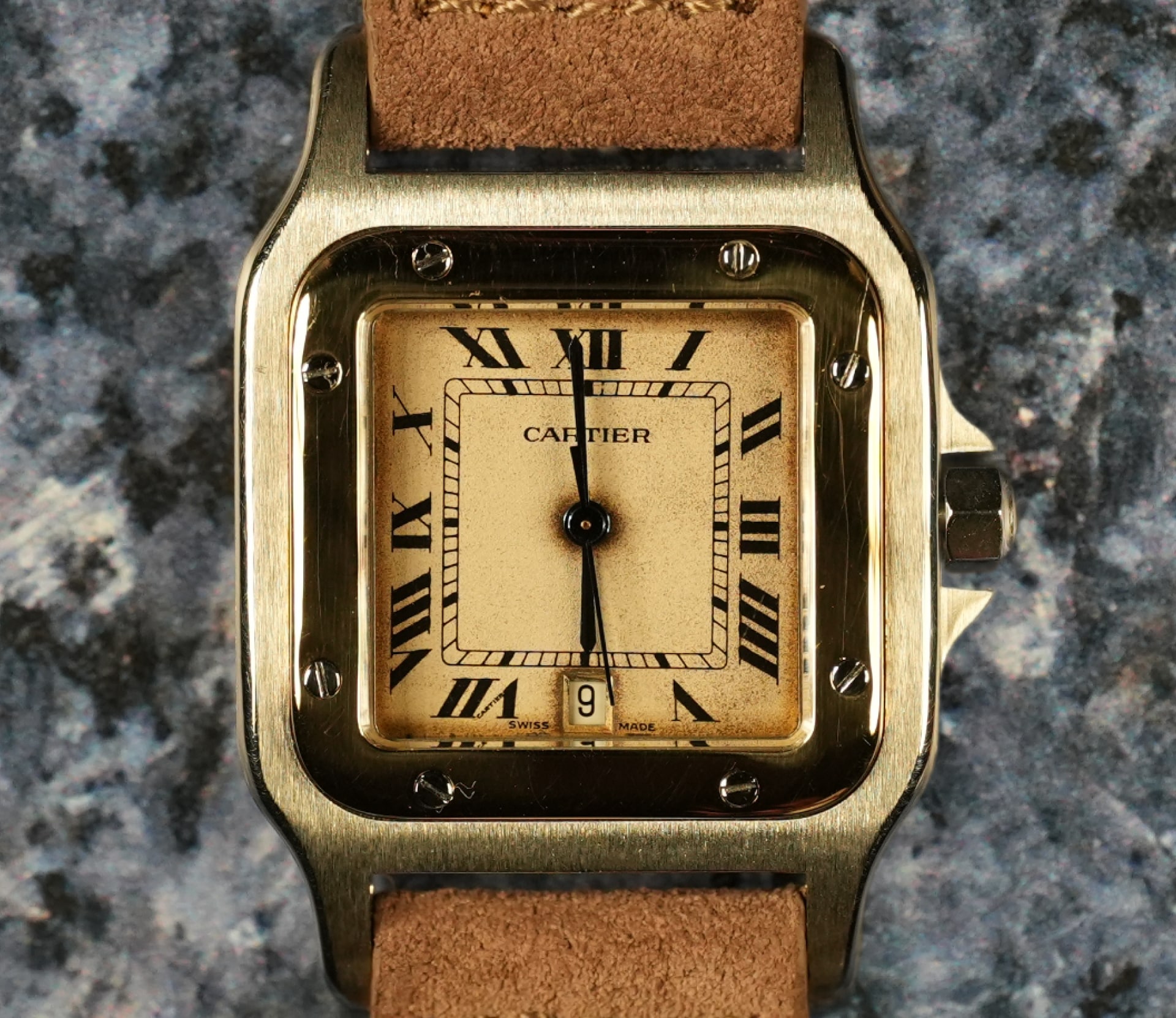 This Quartz Santos Galbee example features a steel case with yellow-gold screwed bezel, sapphire crystal, and a Roman dial that shows pronounced tropical patina—the original cream tone has naturally shifted to warm honey/brown hues in an even, attractive way. It wears comfortably at about 29 mm across (ex-crown). Fitted to a sand-tone leather strap with an unsigned tang buckle. Condition: coherent vintage wear, sharp screw heads, dial with appealing patina.