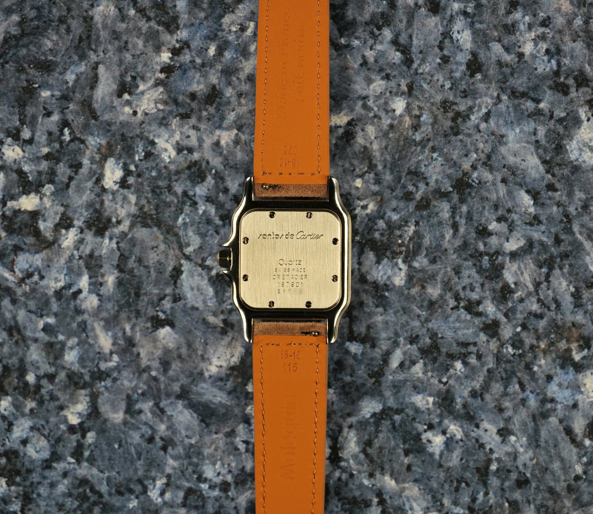 Historical note: the modern steel-and-gold Santos with exposed screws debuted in 1978 and defined the Carrée line through the 1980s–90s.
