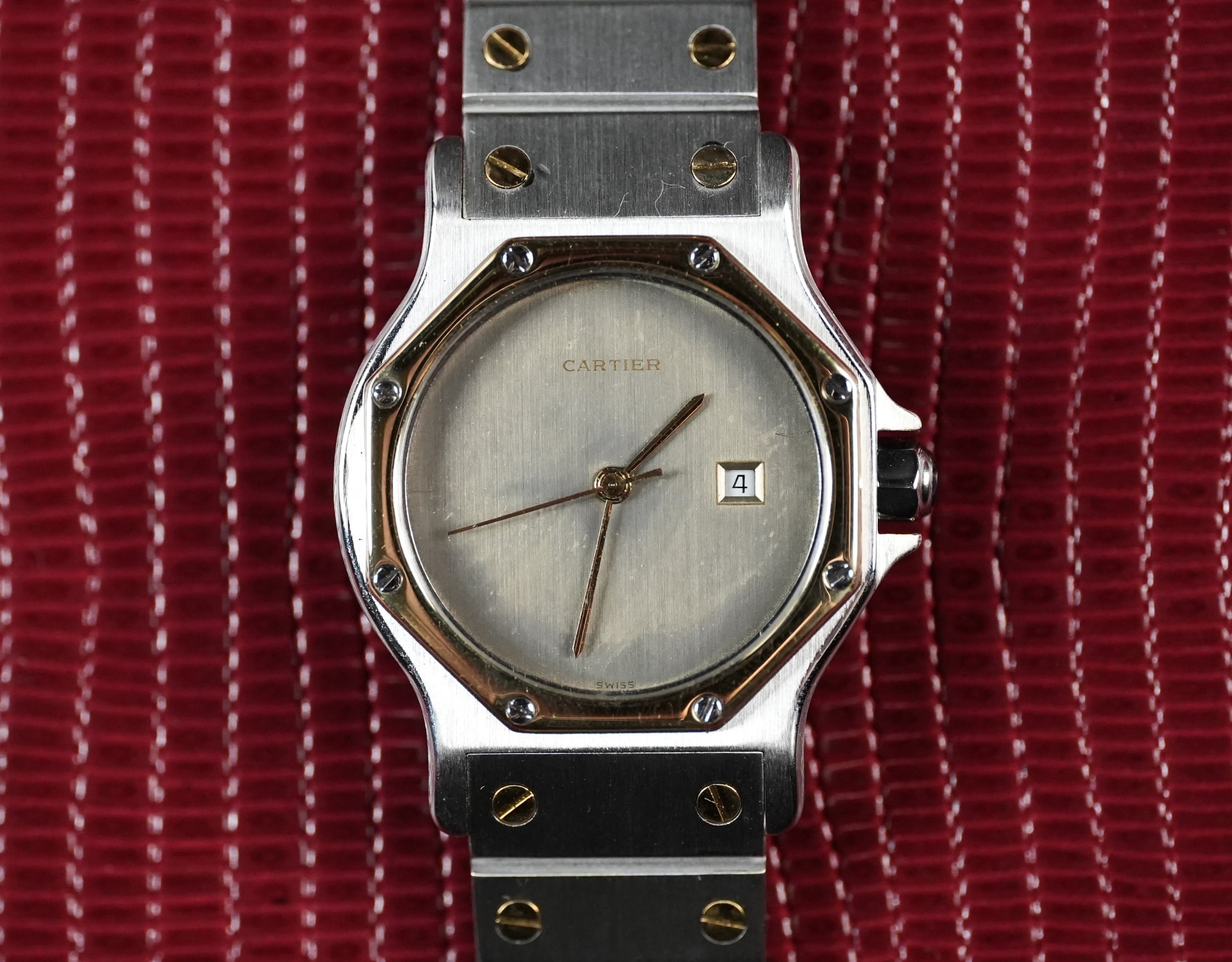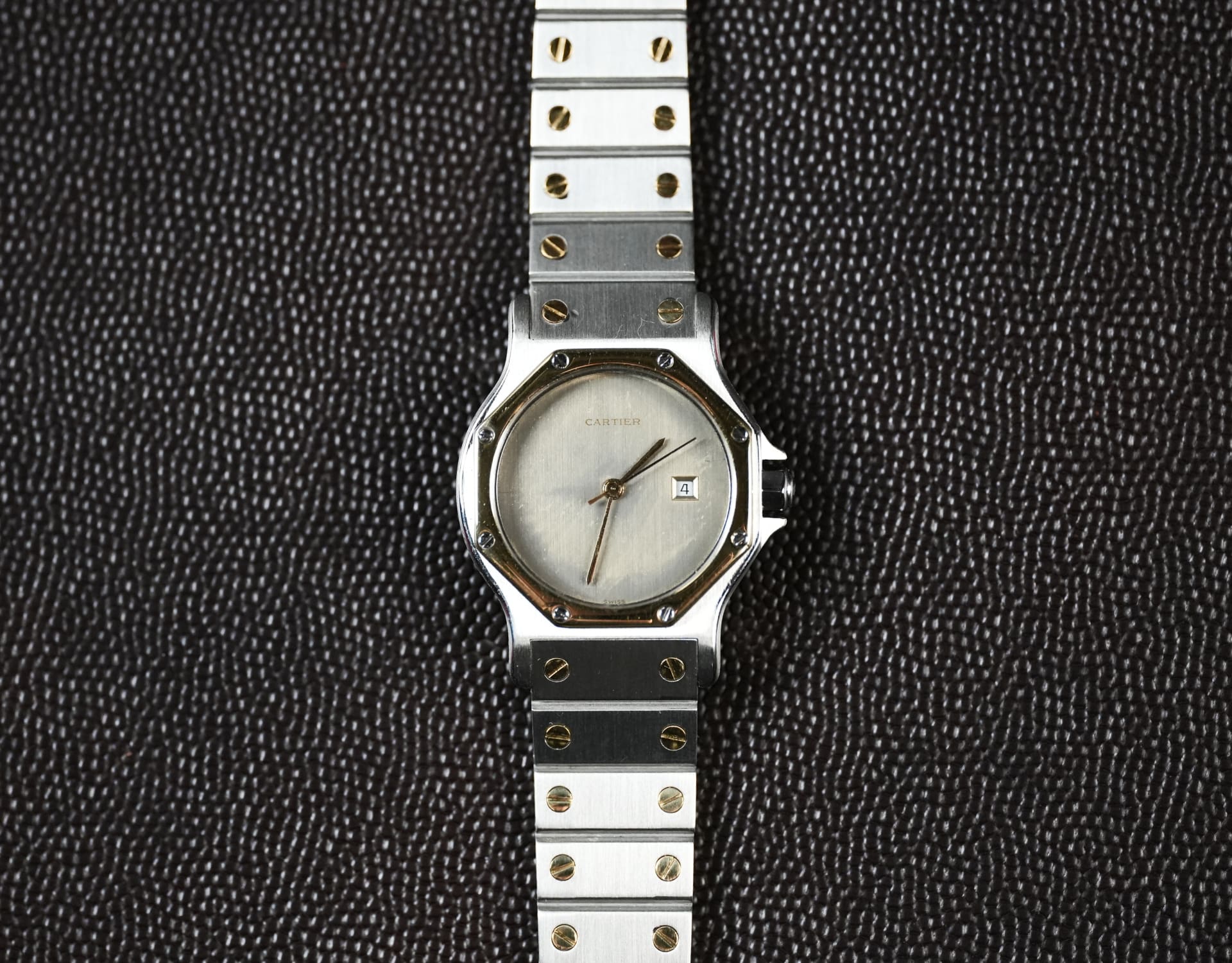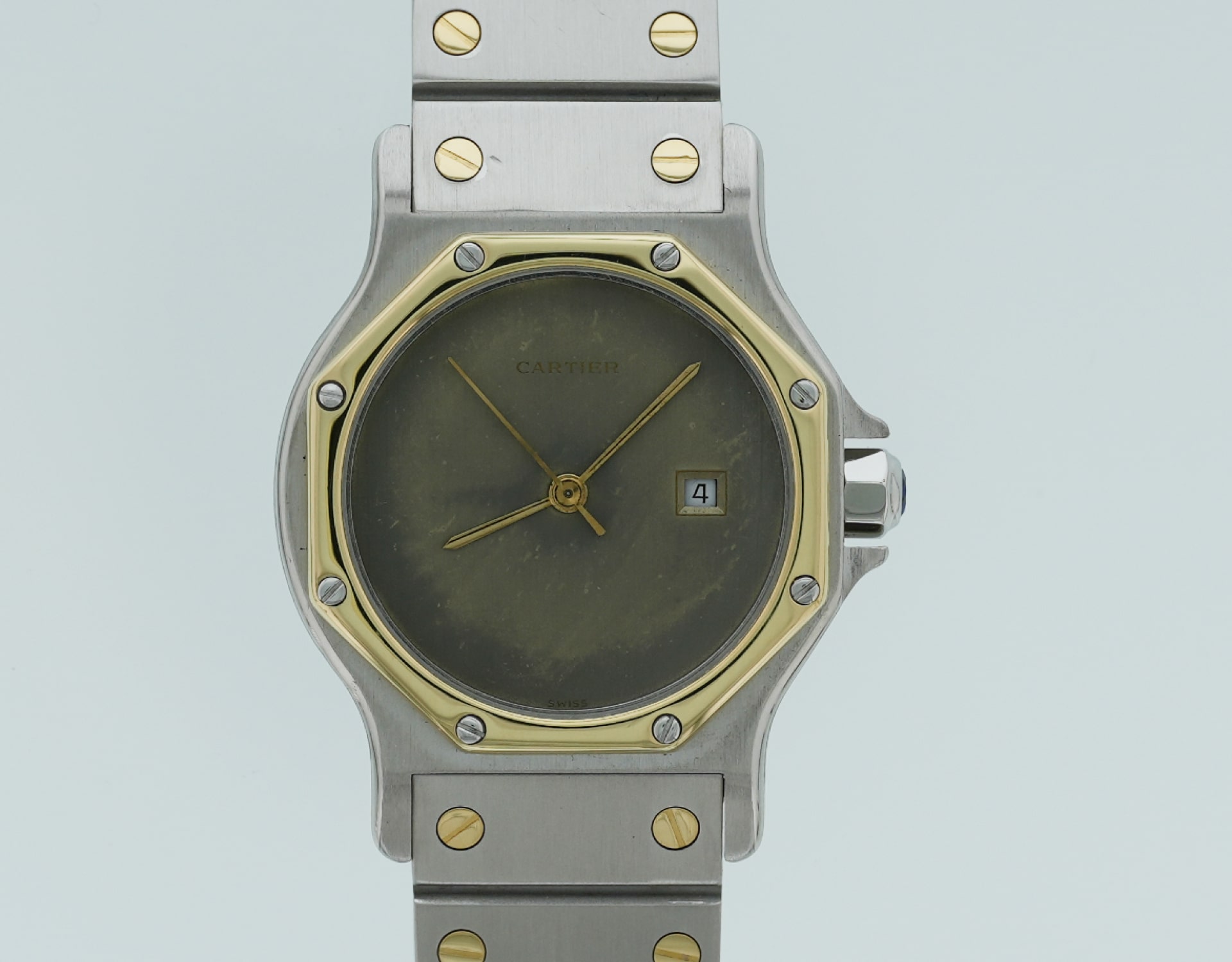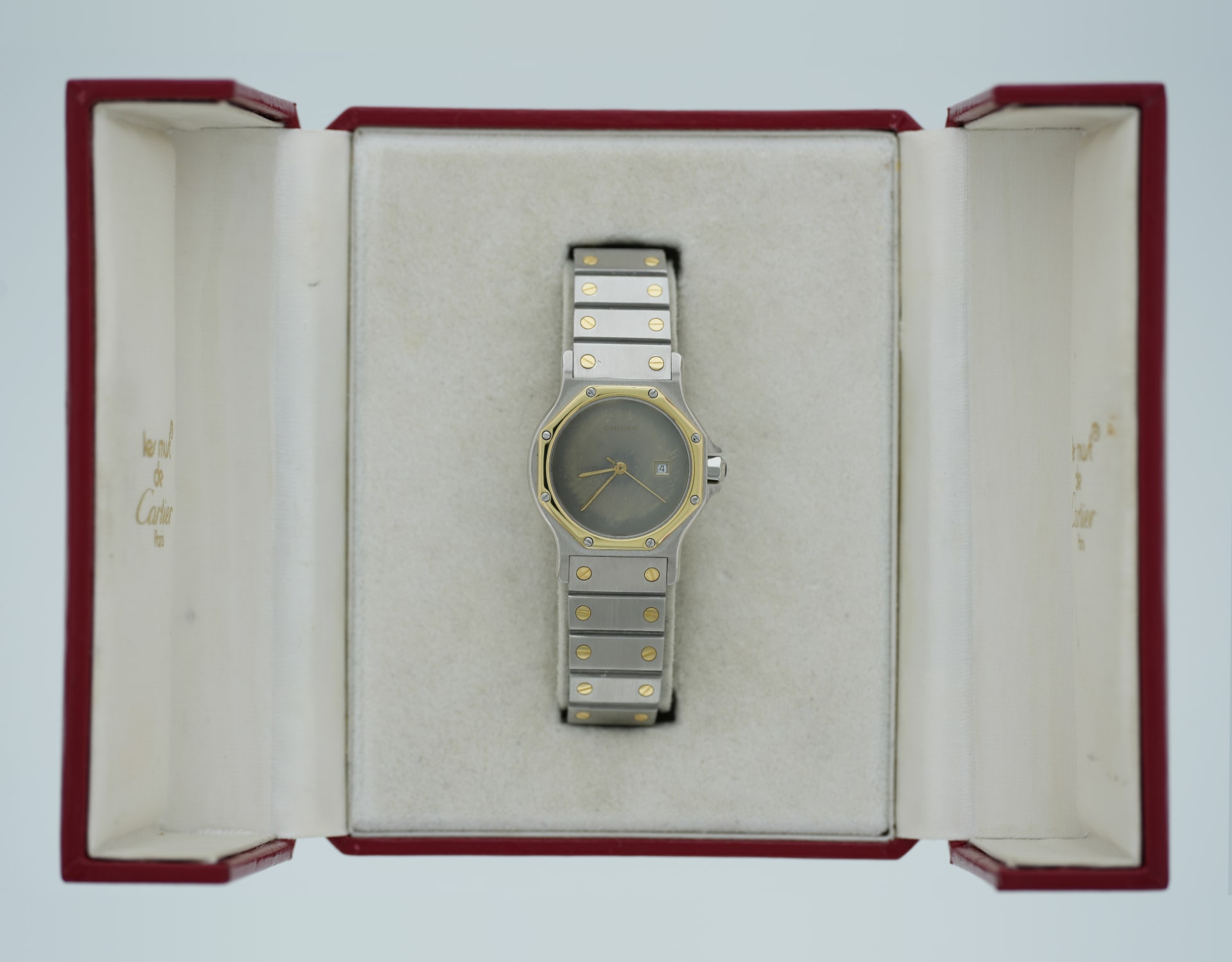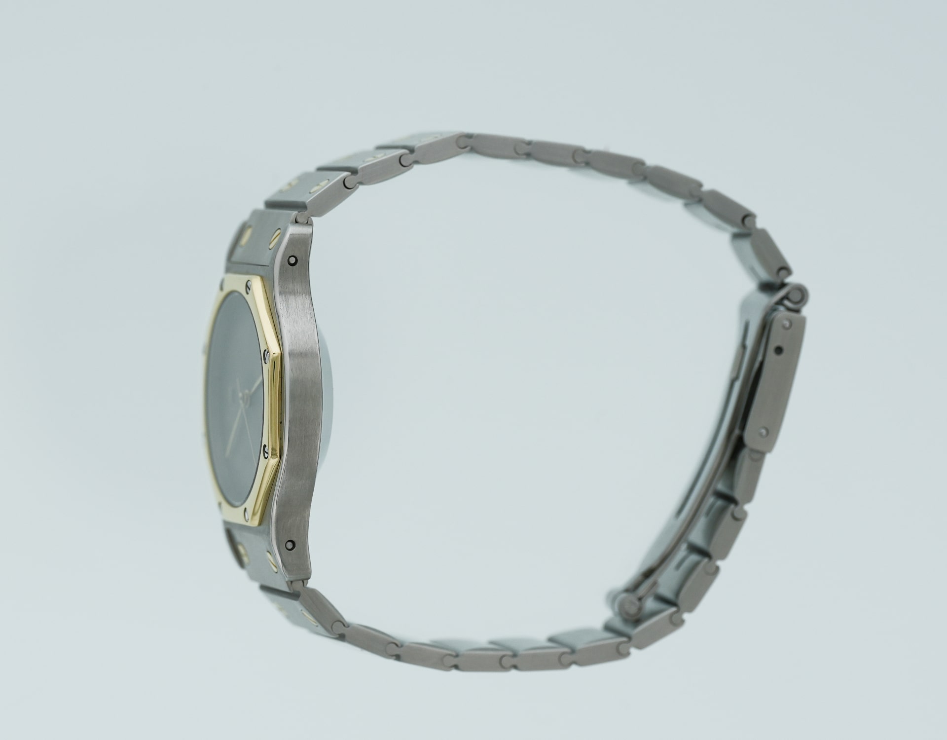 Cartier Santos Octagon ref. 2966, Large Model (LM/GM) in steel & yellow gold, late 1980s–1990s. Historical note: the Octagon branch of the Santos family introduced an eight-sided bezel with screw motif and an integrated bracelet for a crisper, more geometric look.
