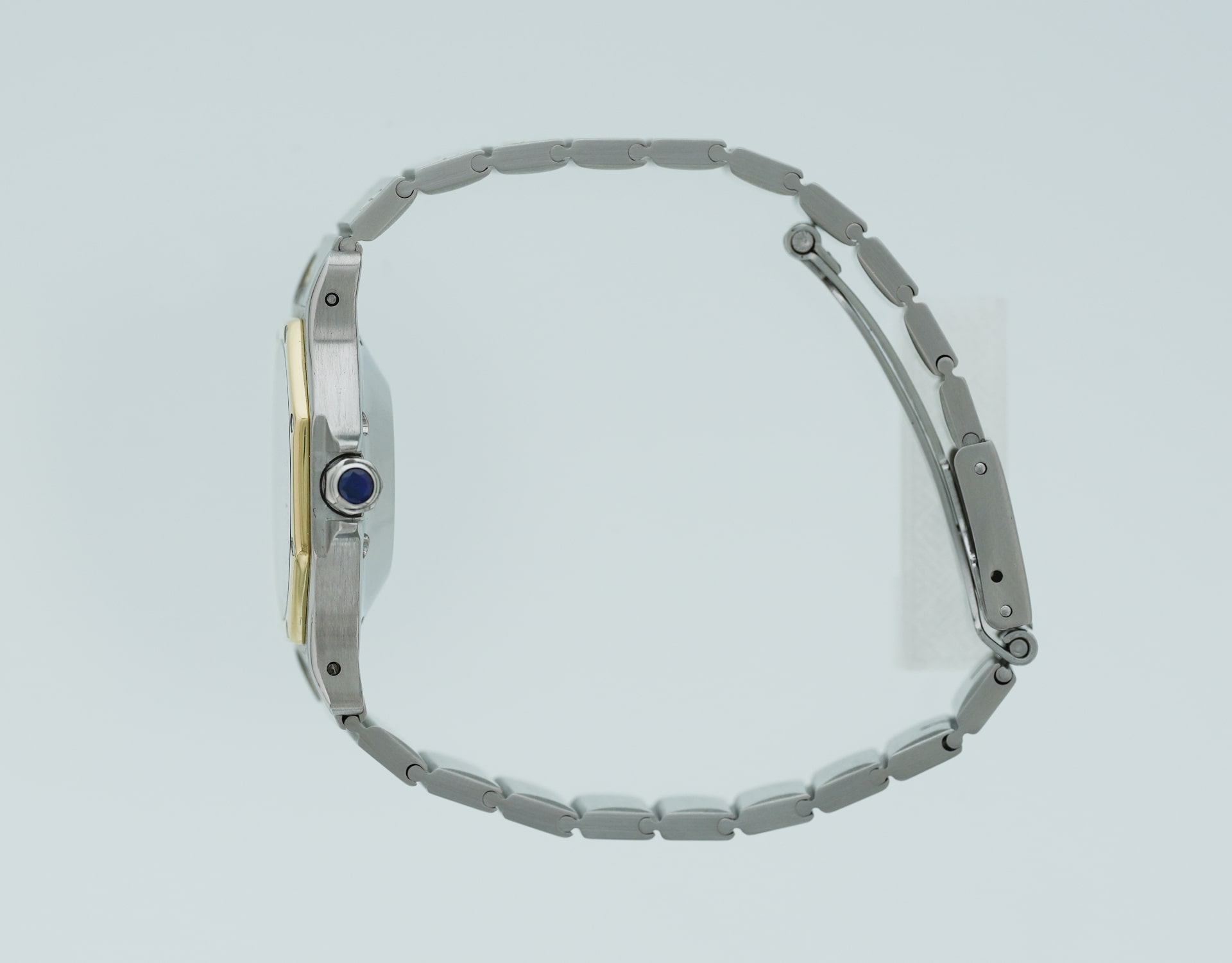Condition: good vintage with light, even signs of age and coherent patina across bezel and dial; crisp case geometry. On its original integrated two-tone Cartier bracelet. Supplied with Cartier box (no papers).
