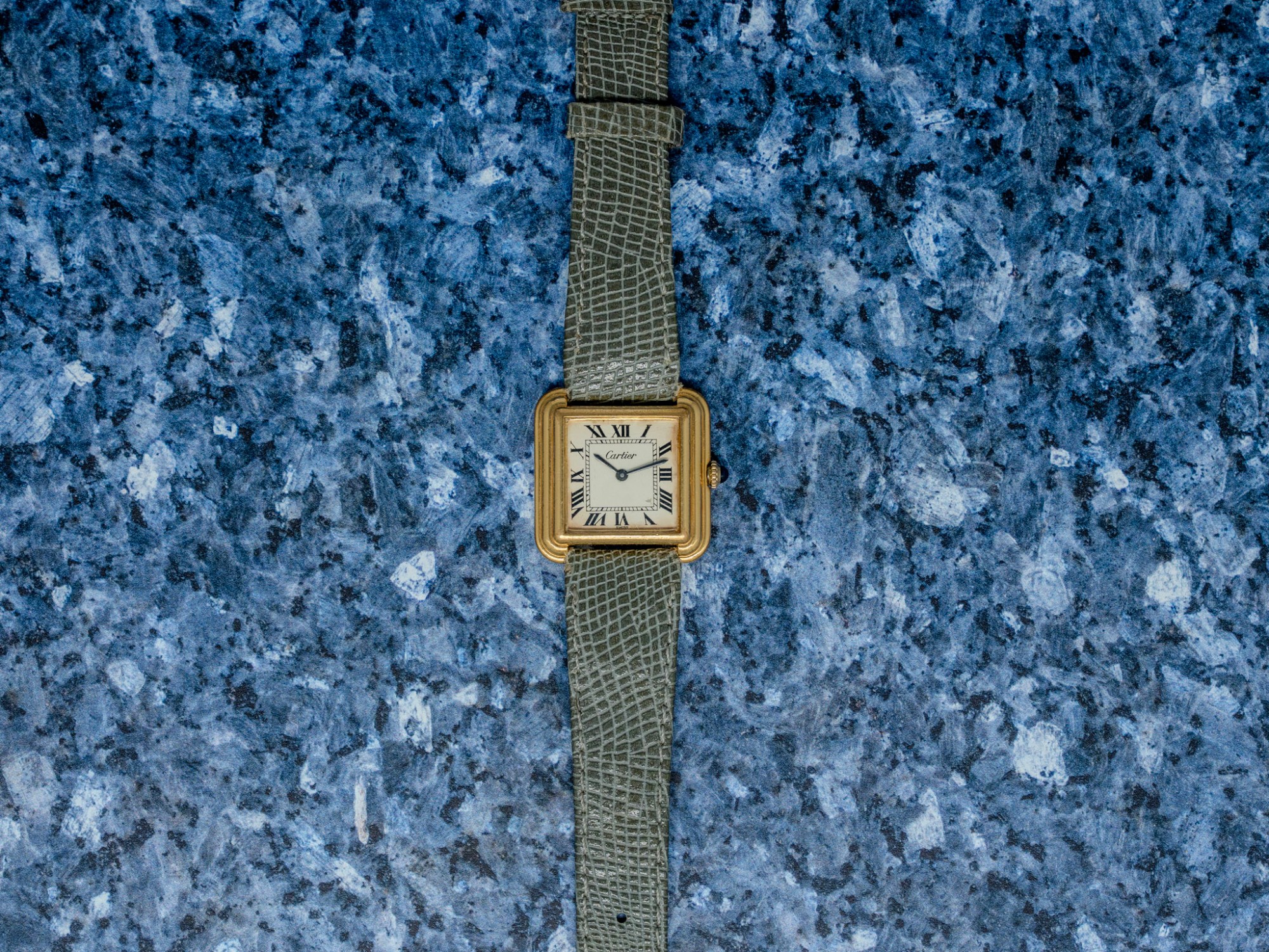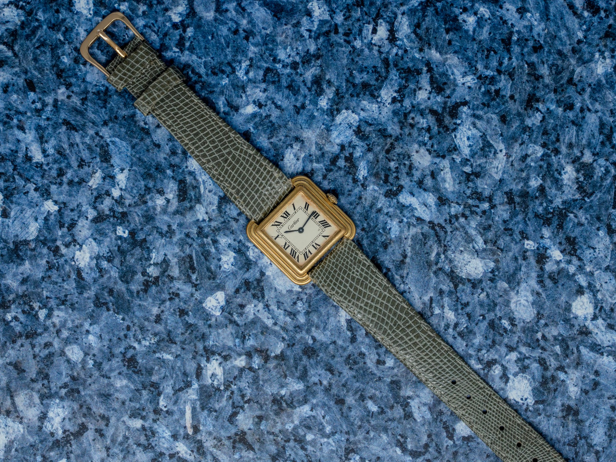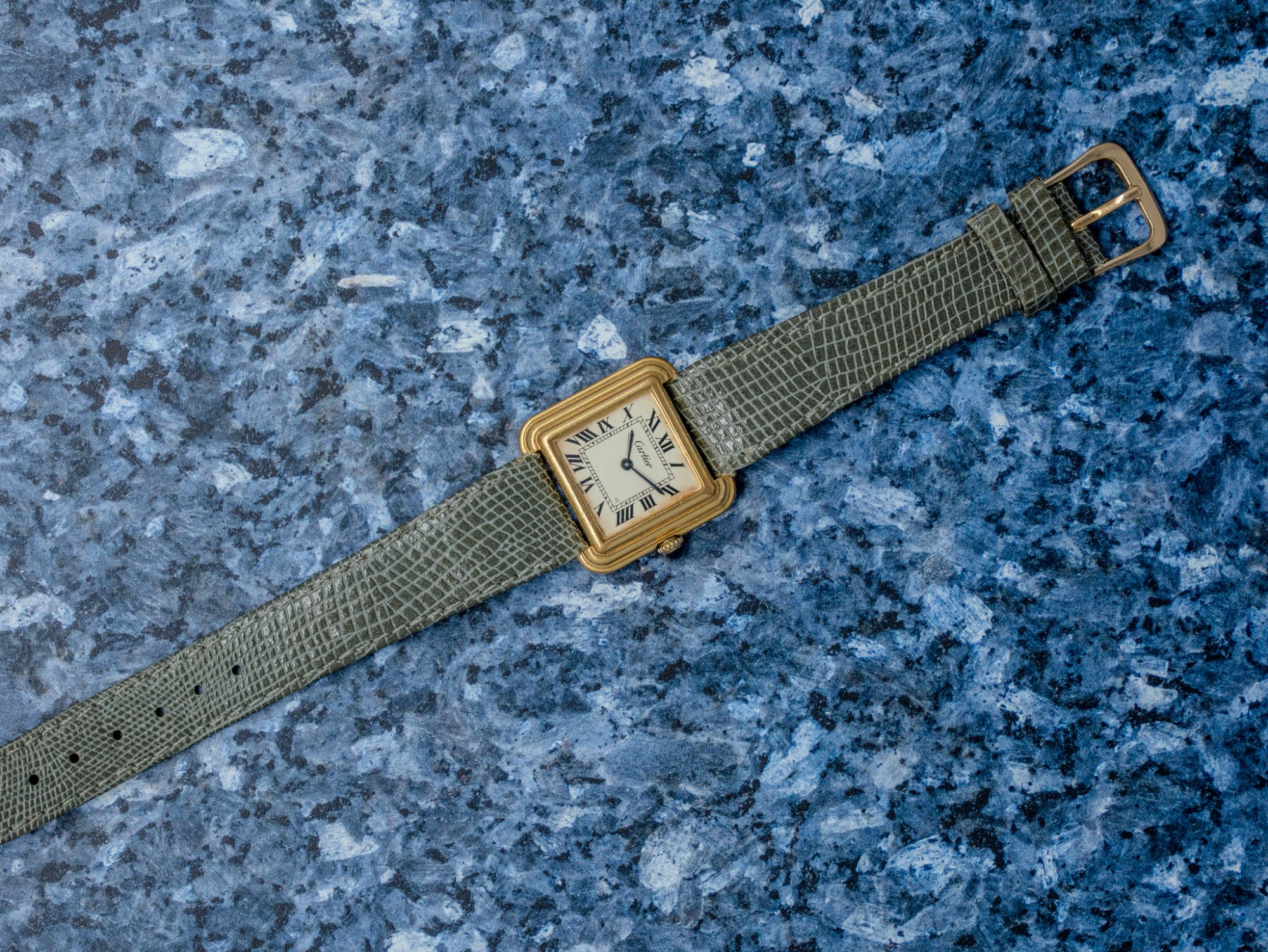 The gold-plated case retains its stepped geometry well, with small scratches consistent with age and careful wear rather than heavy use; the plating remains even across the flanks and lugs. The cream dial shows a small chip, honestly disclosed, but the printed Roman numerals, minute track, and Cartier signature remain crisp and fully legible. The blued sword hands are original and frame the dial nicely. Mineral crystal is clean, and the crown turns smoothly in winding and setting.