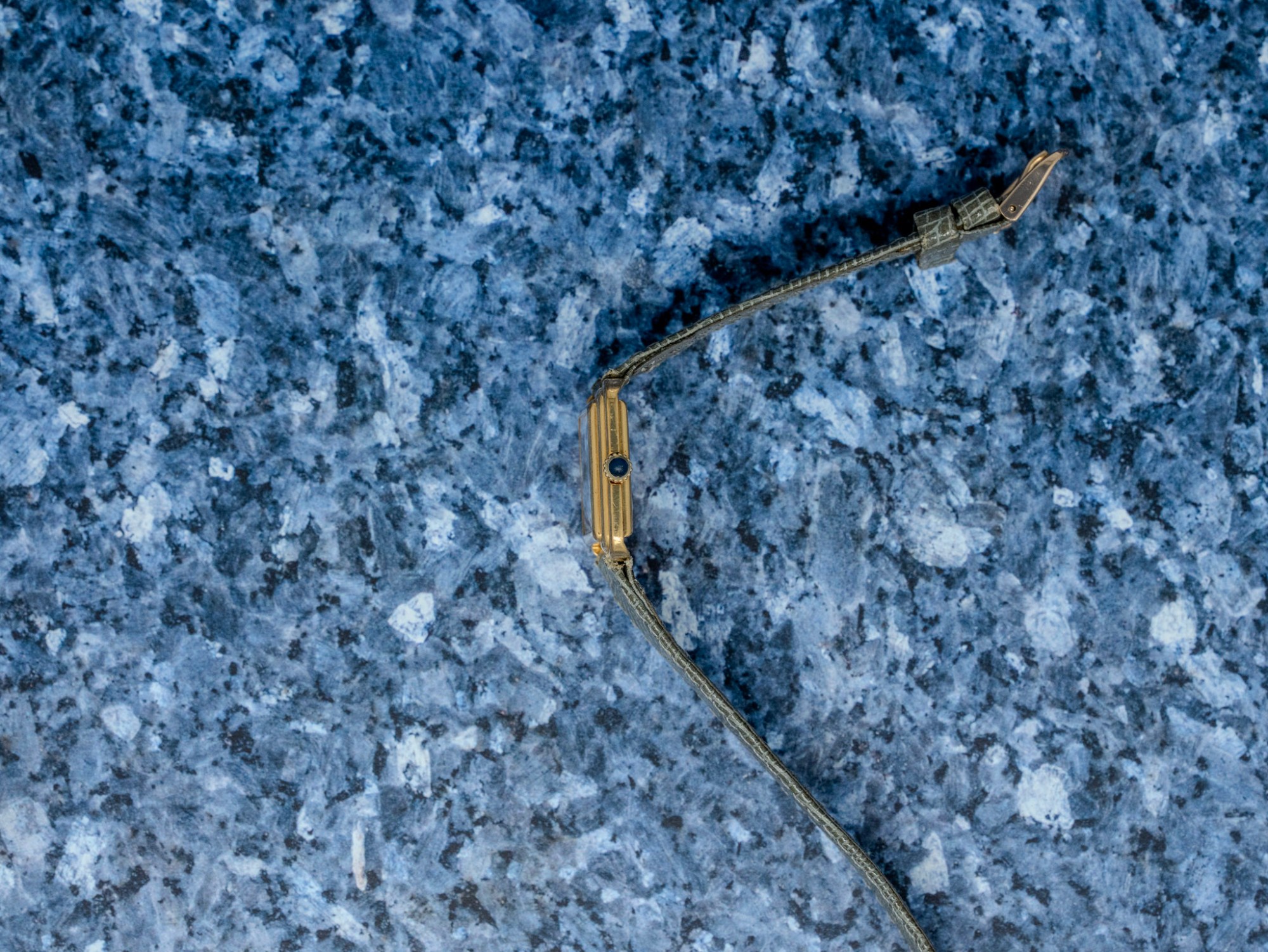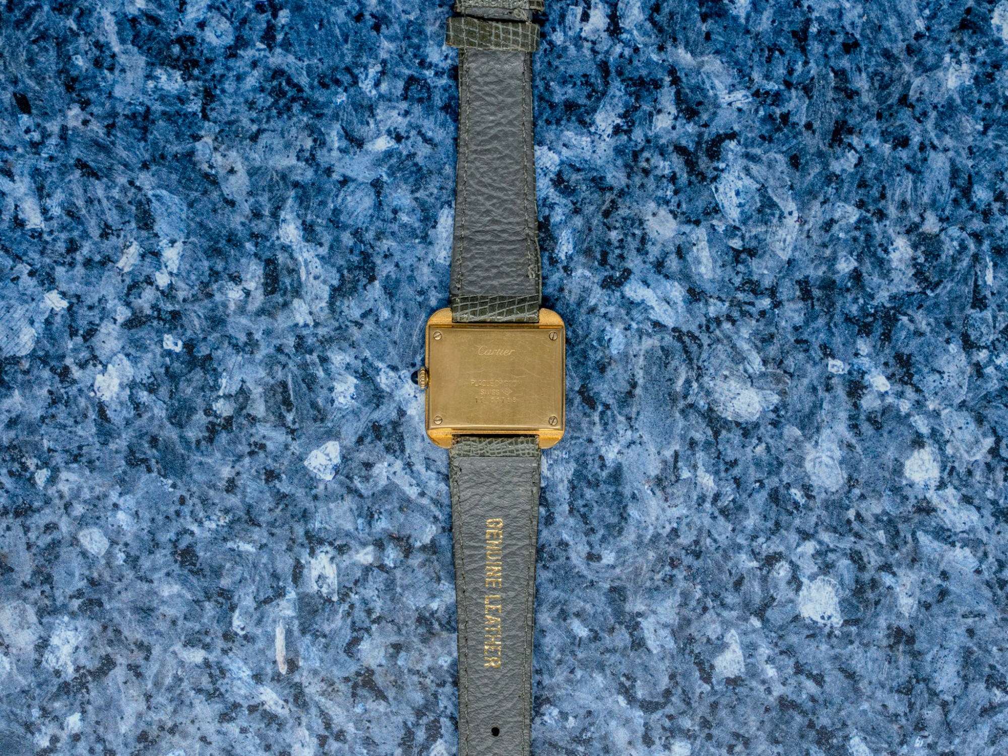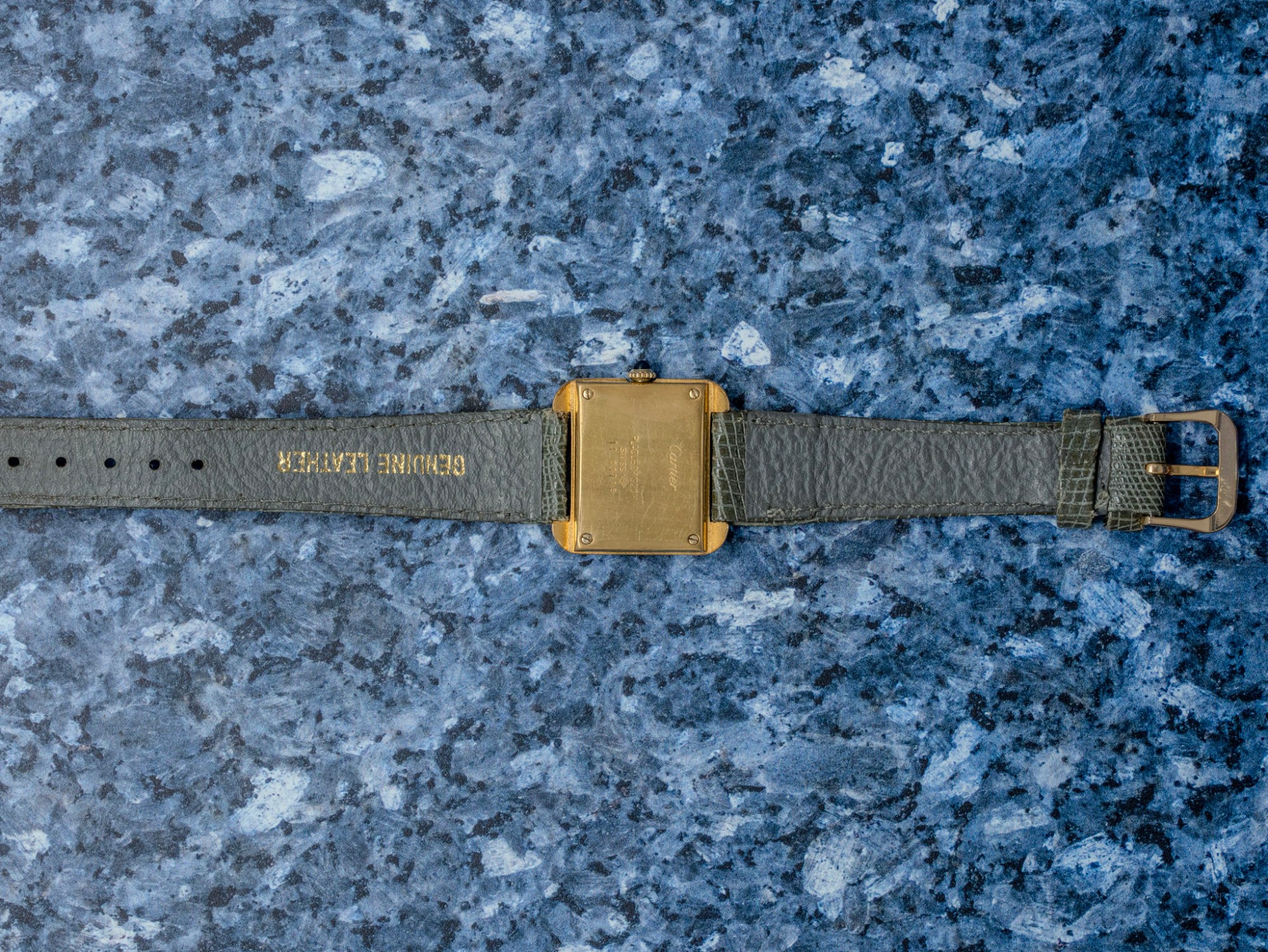 The gold-plated case retains its stepped geometry well, with small scratches consistent with age and careful wear rather than heavy use; the plating remains even across the flanks and lugs. The cream dial shows a small chip, honestly disclosed, but the printed Roman numerals, minute track, and Cartier signature remain crisp and fully legible. The blued sword hands are original and frame the dial nicely. Mineral crystal is clean, and the crown turns smoothly in winding and setting.