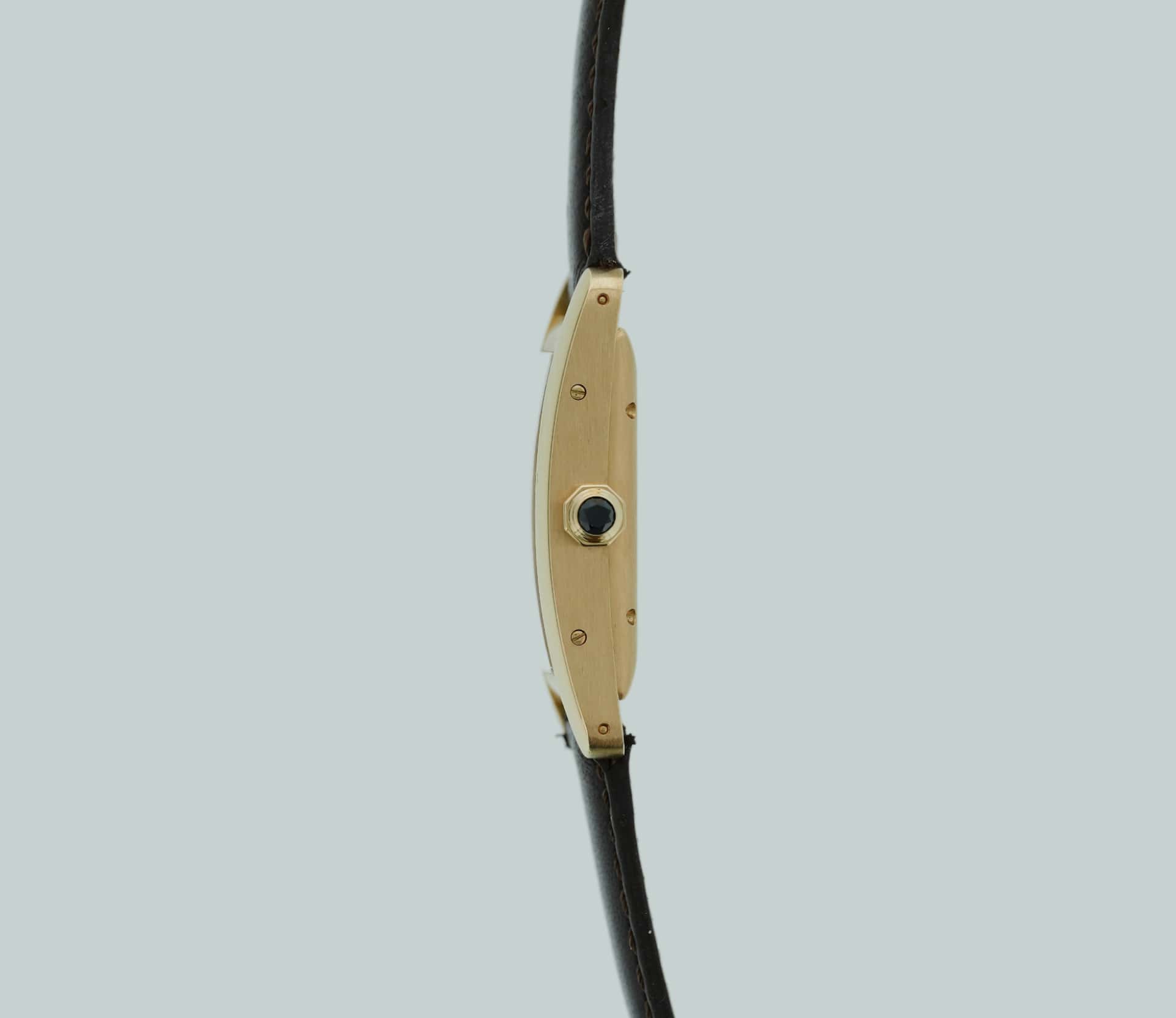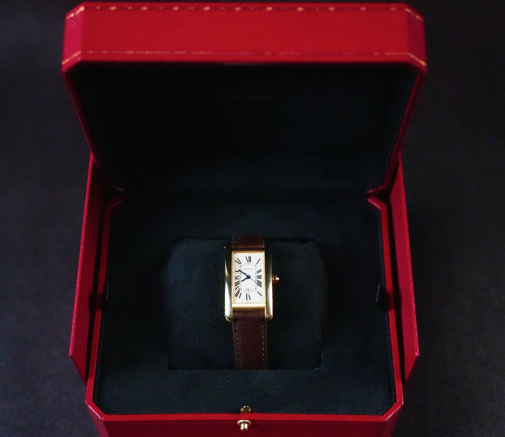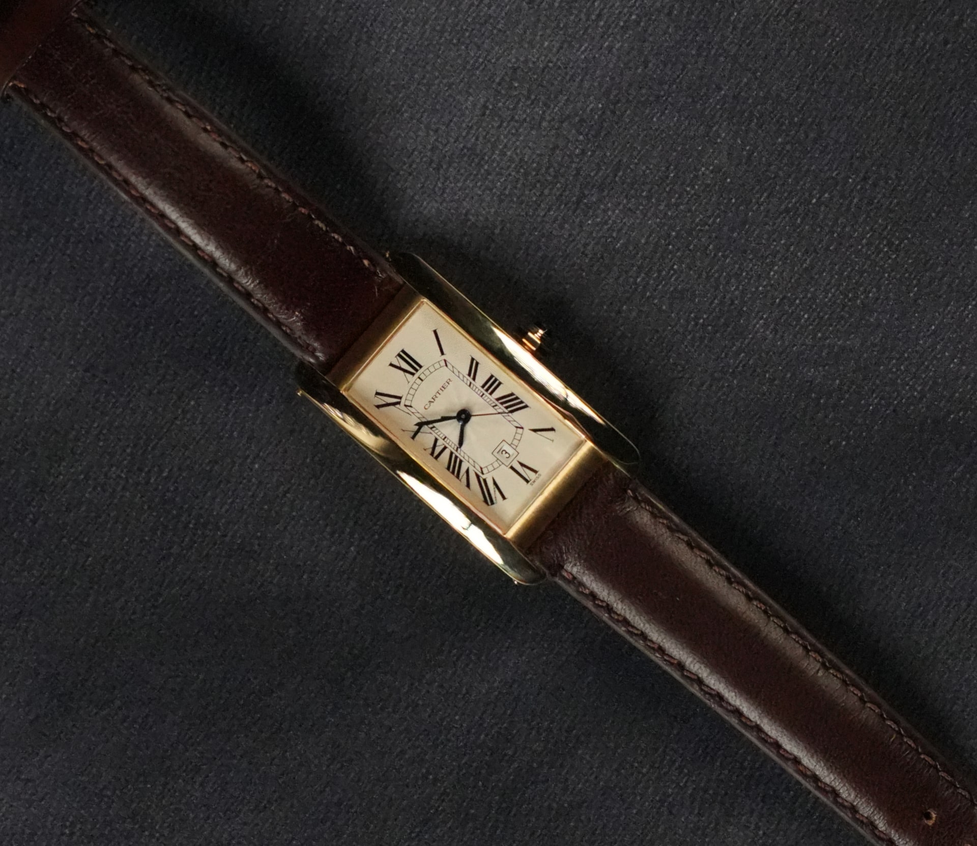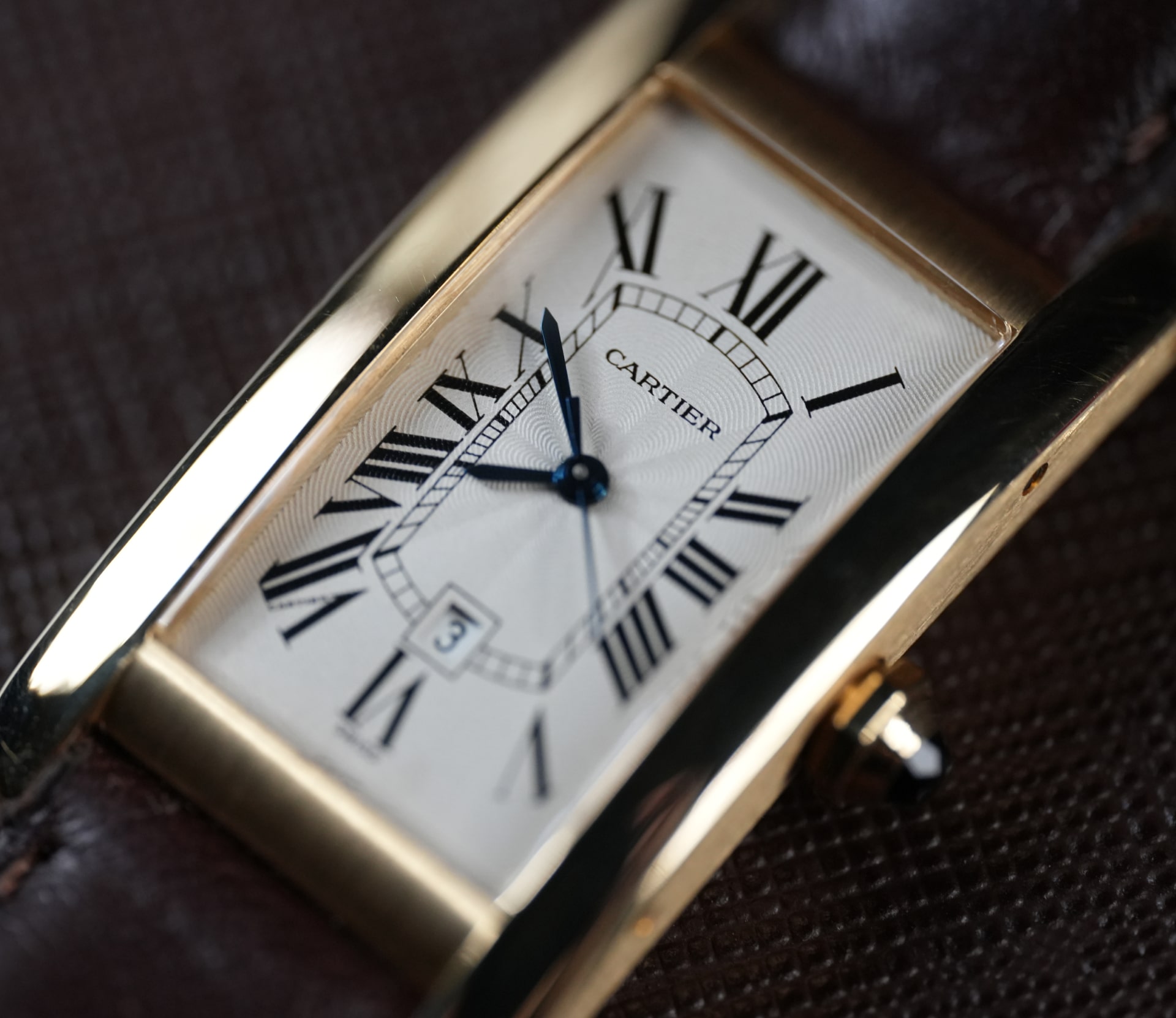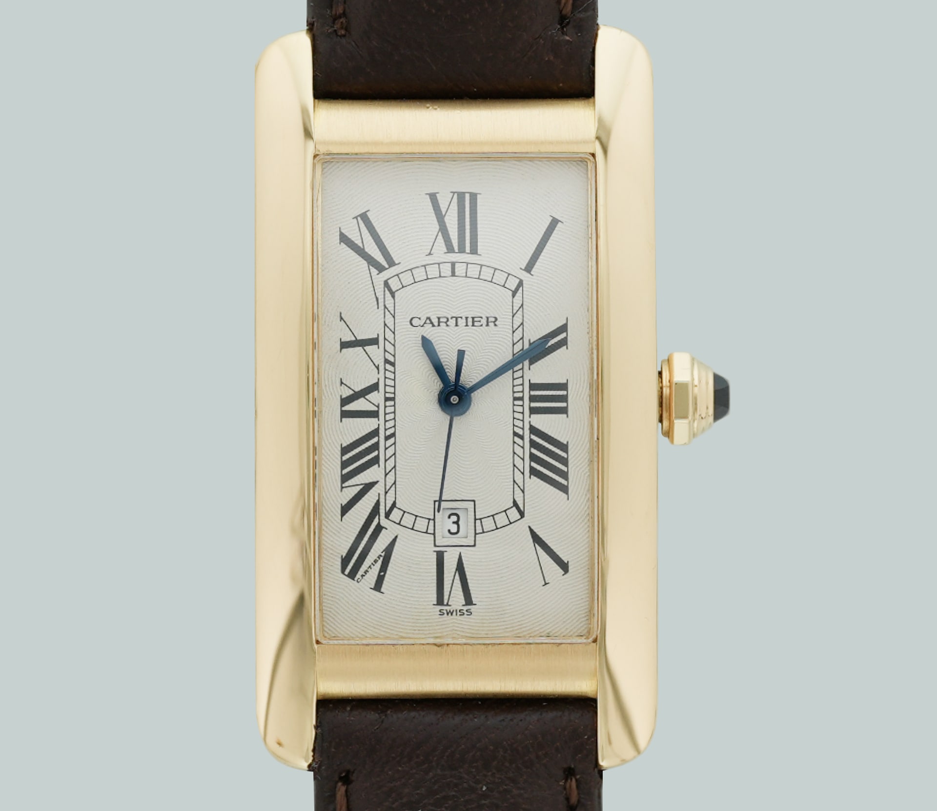 Cartier Tank Américaine ref. 1725 in 18k yellow gold, midsize unisex 41 × 22 mm, 1990s. Curved rectangular case with sapphire crystal; guilloché dial with Roman numerals and blued hands; blue cabochon crown. Inside is Cartier caliber 077 – automatic with date.