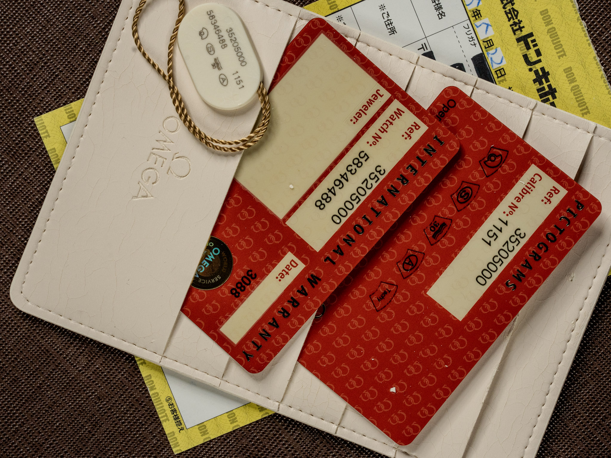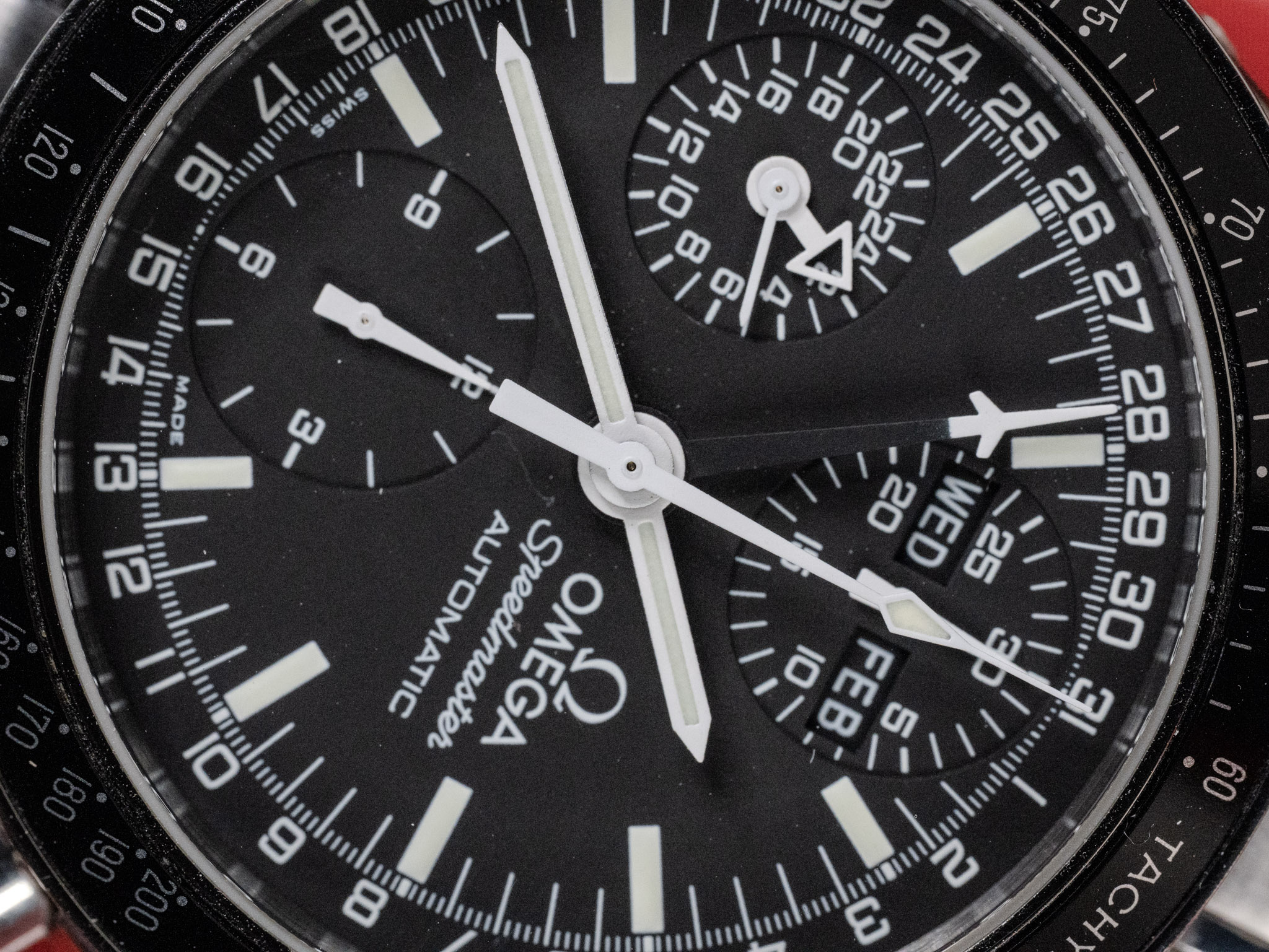 This 1995 example comes as a full set with its original Omega red box, outer box, international warranty card, hang tag, warranty card holder, operating instructions booklet, and additional bracelet links. The black triple-register dial is clean with sharp printing and well-defined sub-dials. The luminous plots and handset appear to be original to the watch, with consistent aging throughout.
