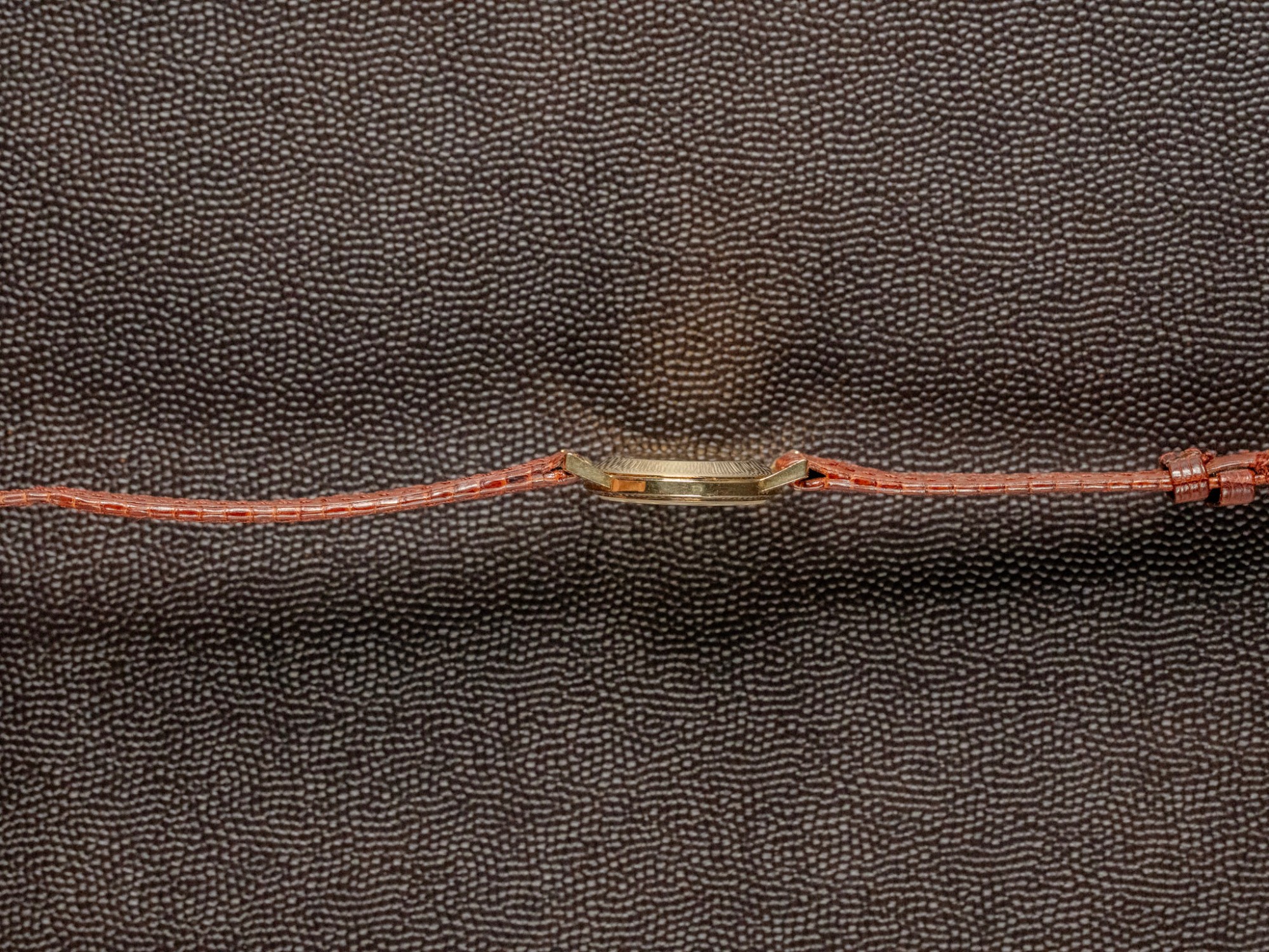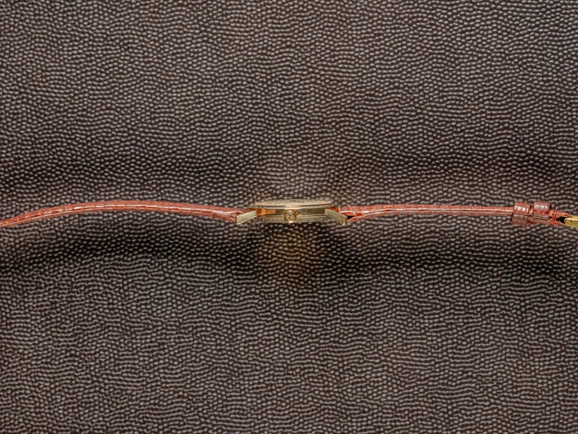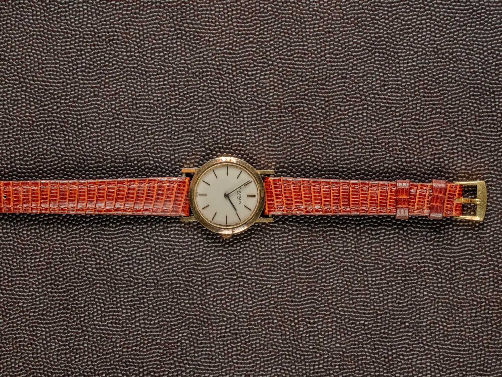 The 25mm 18k yellow gold case retains its original proportions, with the warm glow and rich patina that develops on unpolished gold over five decades. The case shows minor signs of wear consistent with regular use. Professional polishing can be arranged free of charge upon request. The silver dial has aged beautifully, retaining clean printing and sharp applied indices. The gold handset appears original and matches the dial tone perfectly.
