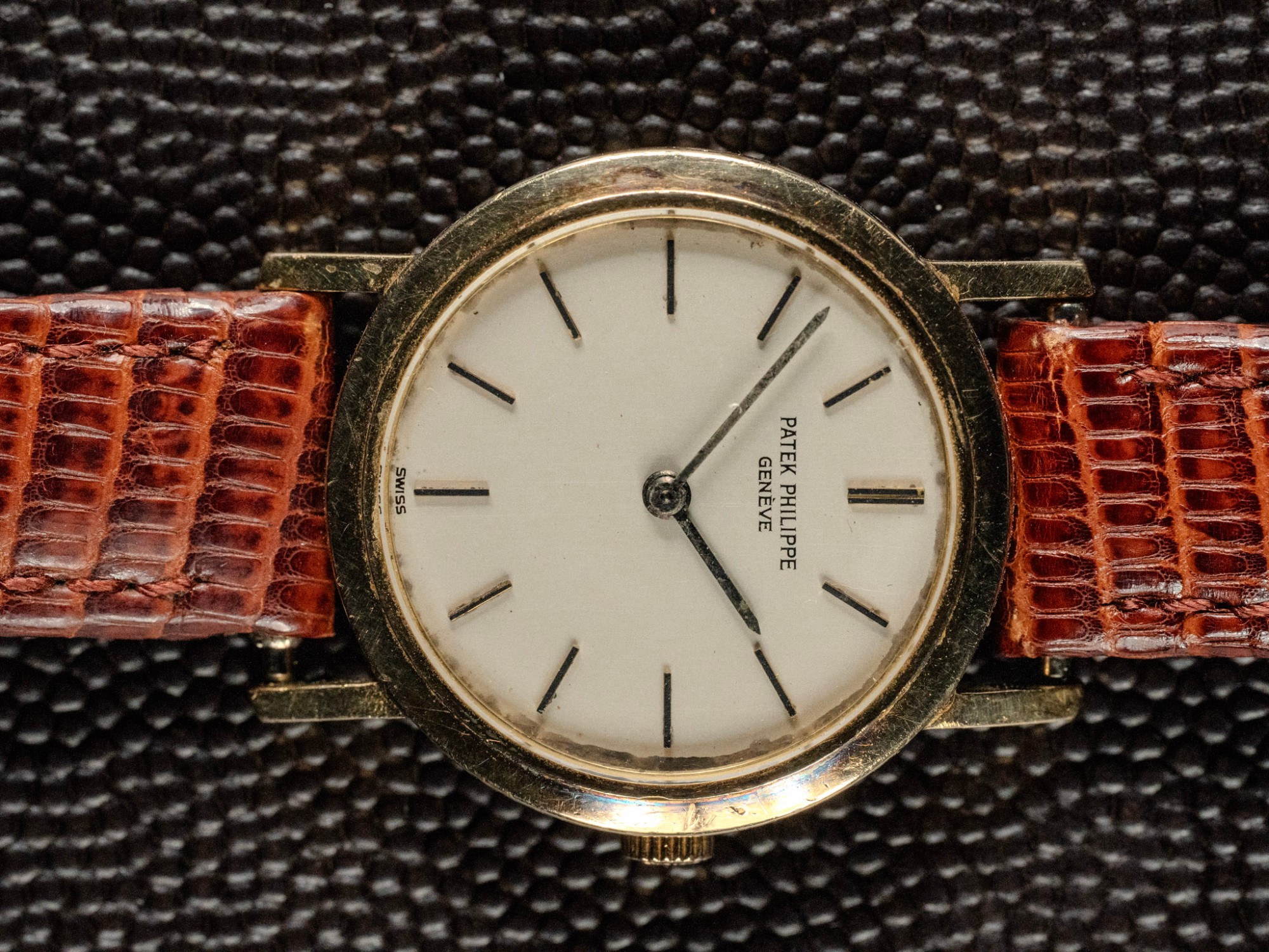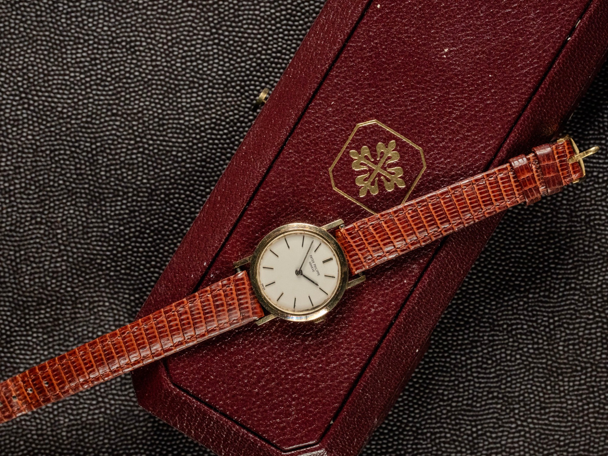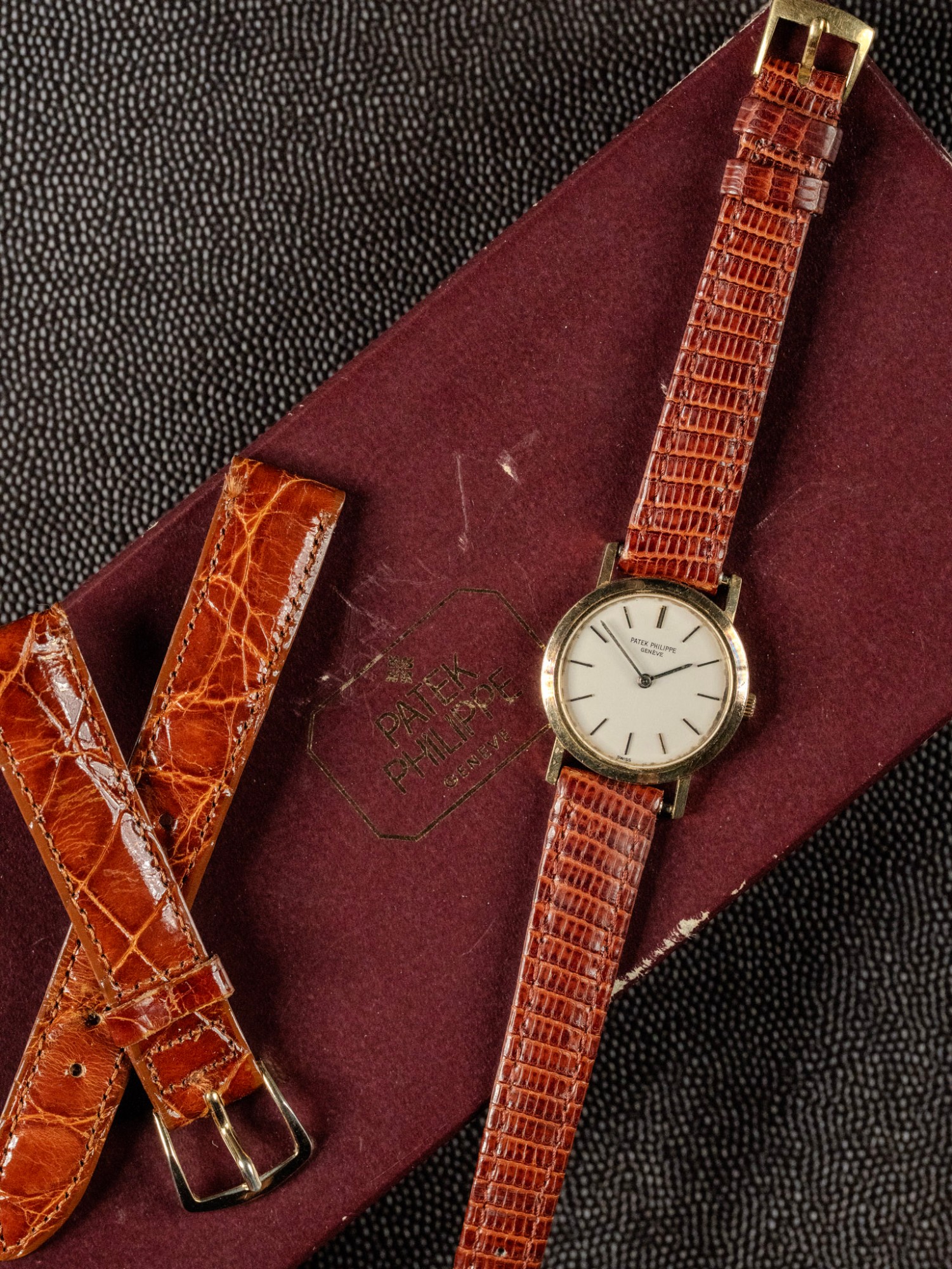 This particular example dates to 1975 and comes complete with its original Patek Philippe presentation box, though no papers accompany the watch. The silver dial is the classic configuration for this reference, featuring applied gold baton indices and matching gold dauphine hands, with the discreet Patek Philippe Genève signature at the center.