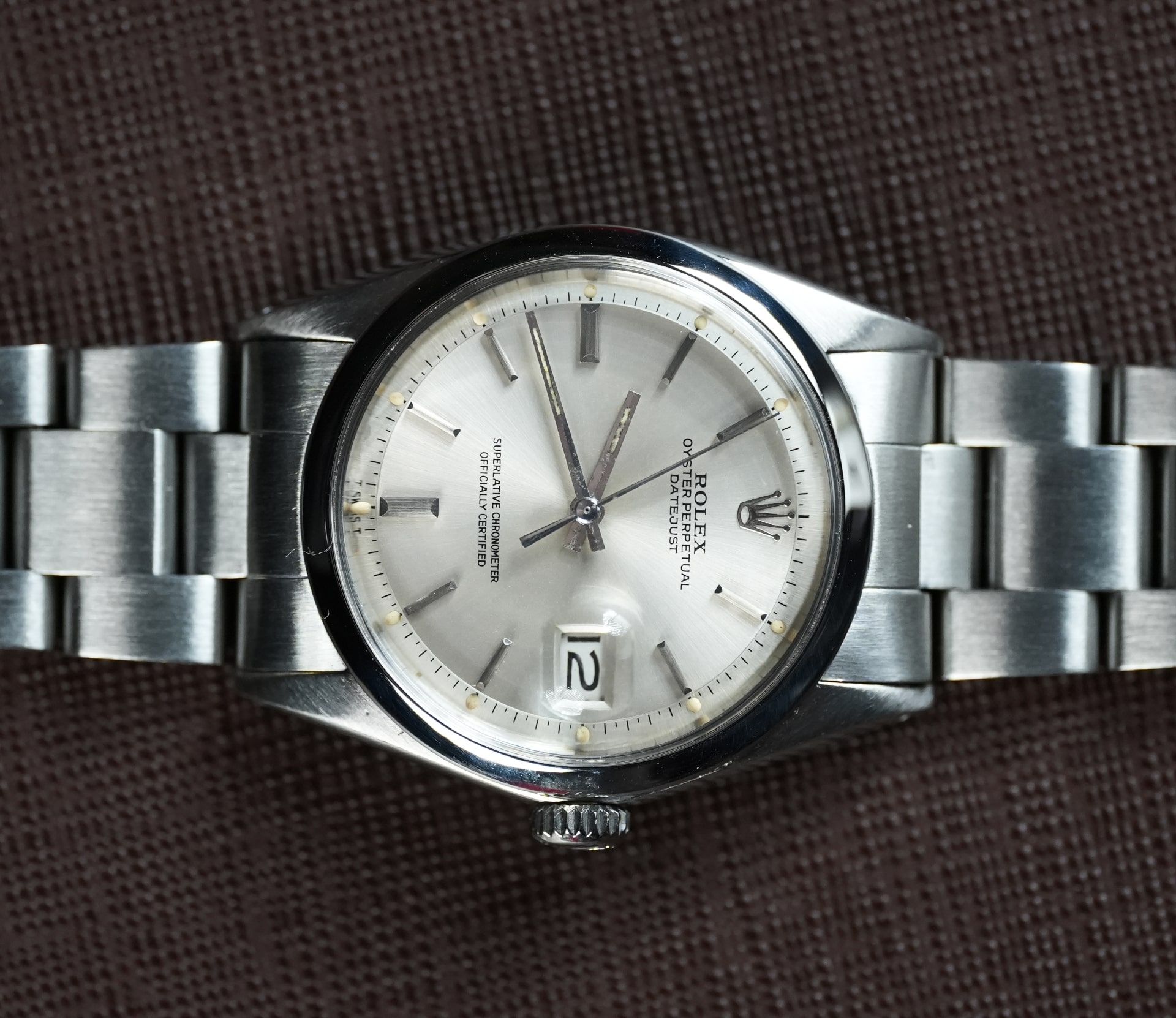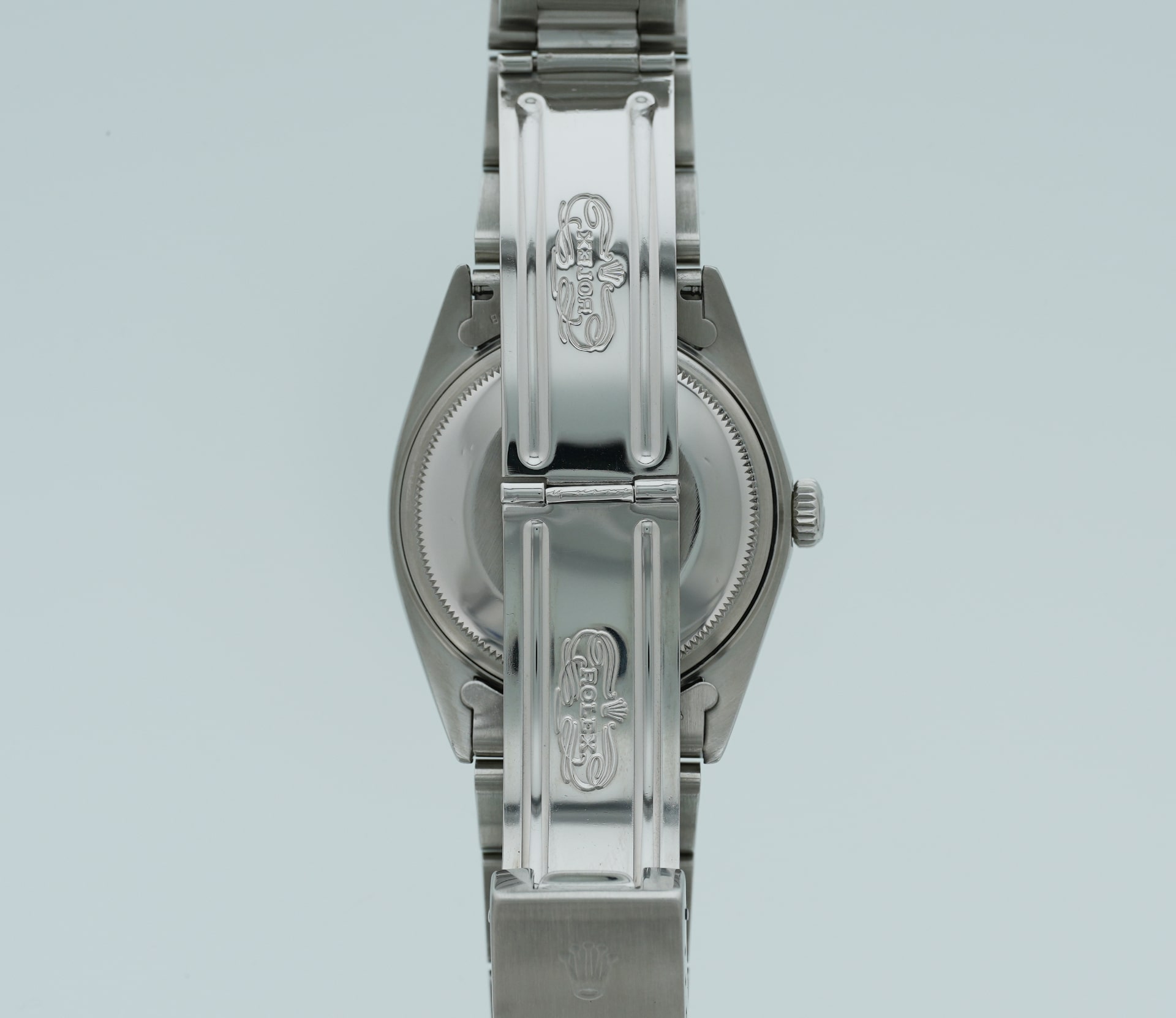 This example features a subtle grey dial with applied batons, an acrylic crystal with Cyclops, and the dependable Rolex cal. 1570 automatic. Condition is strong and coherent: sharp case lines, clean dial, smooth crown/date operation. It is currently fitted to a Rolex Oyster bracelet ref. 78360, adding a versatile, sport-elegant feel and comfortable daily wear.