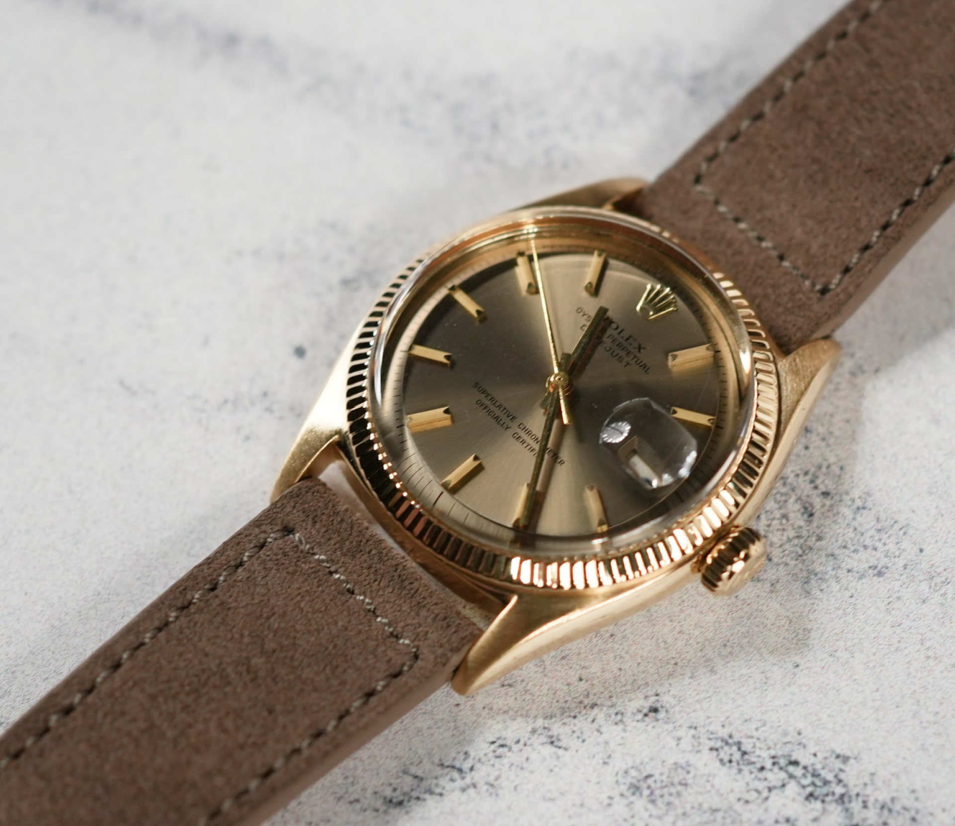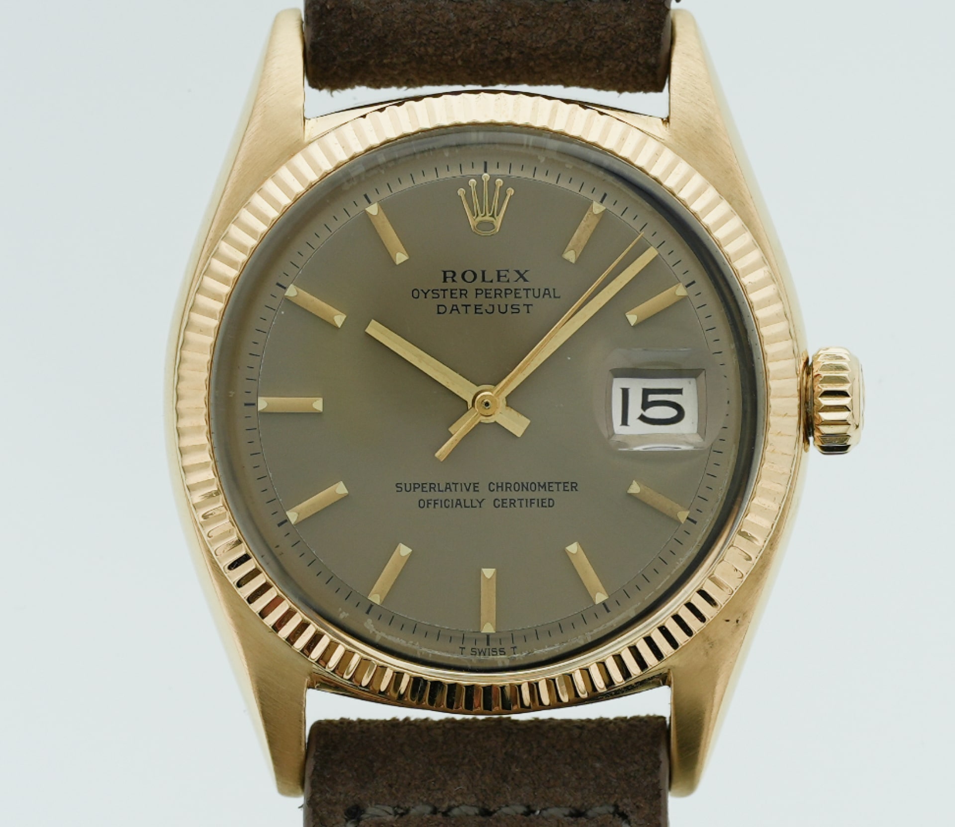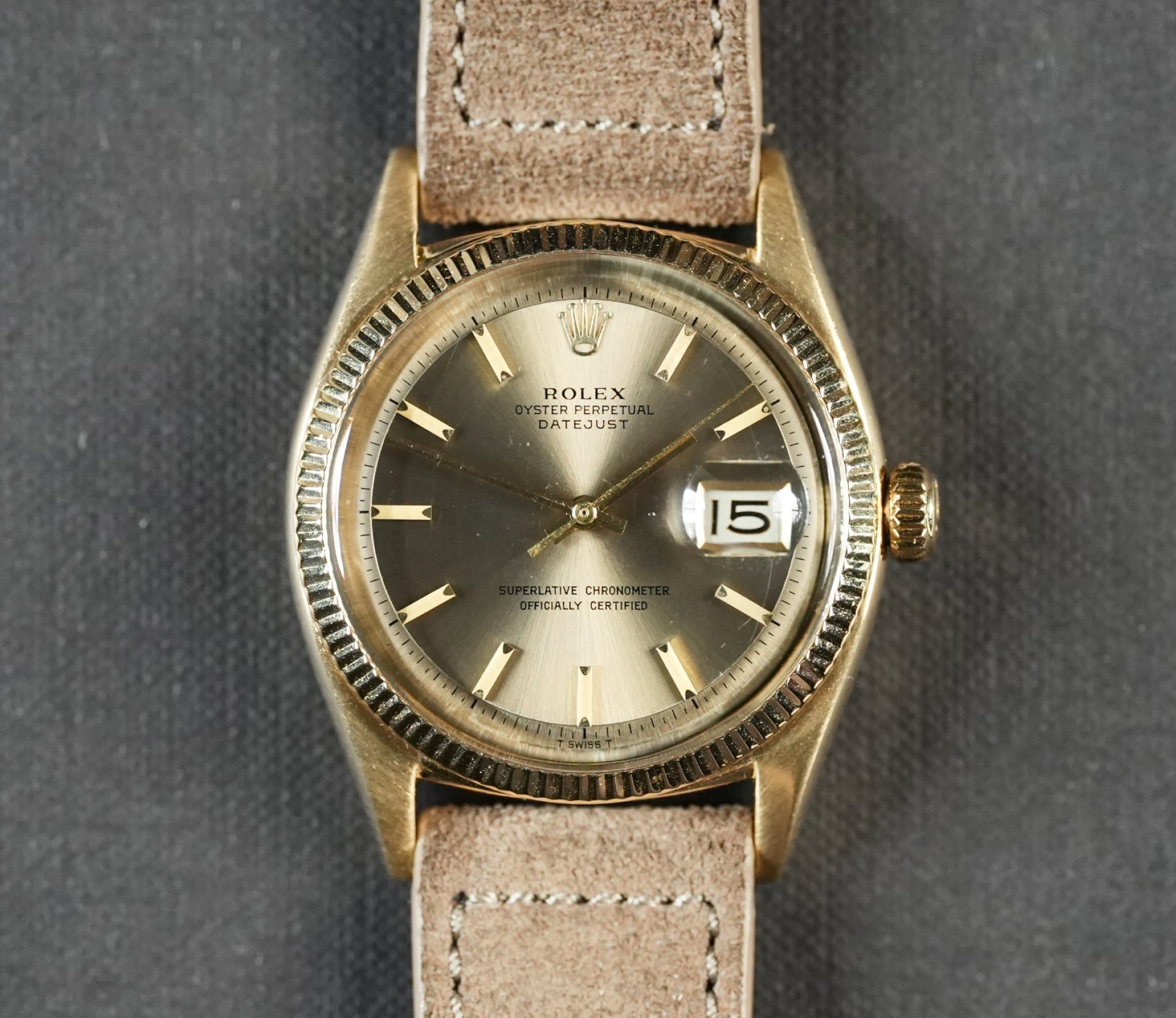Rolex Datejust ref. 1601/8 in 18k yellow gold, 36 mm, 1970s. Fluted bezel, plexiglass, and the automatic cal. 1570 with date. The dial is grey sunburst with applied gold batons and matching baton hands—clean, versatile look.