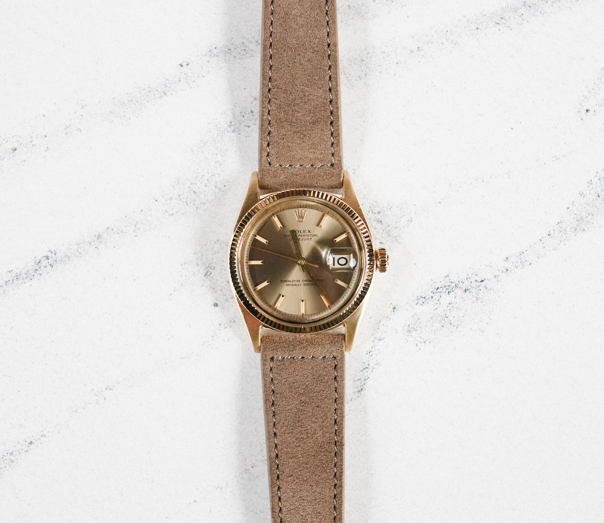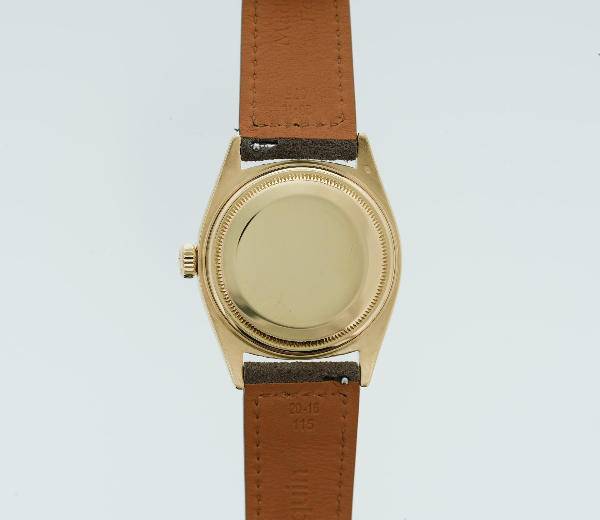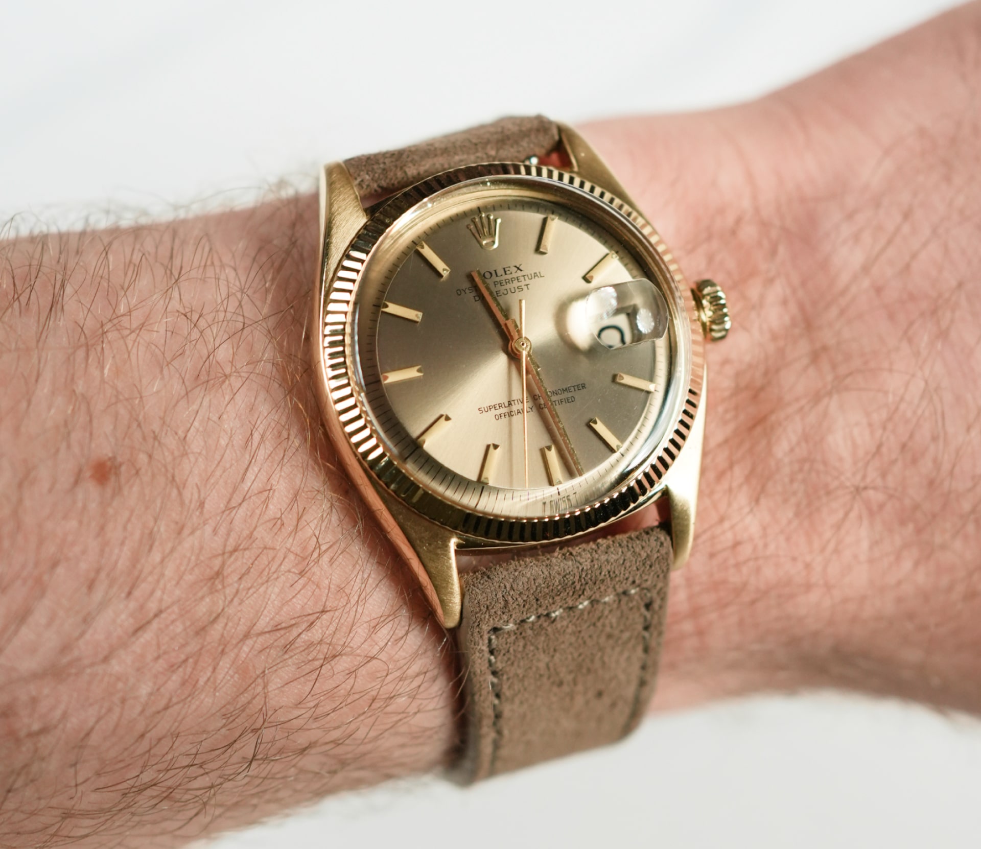 Rolex Datejust ref. 1601/8 in 18k yellow gold, 36 mm, 1970s. Fluted bezel, plexiglass, and the automatic cal. 1570 with date. The dial is grey sunburst with applied gold batons and matching baton hands—clean, versatile look.