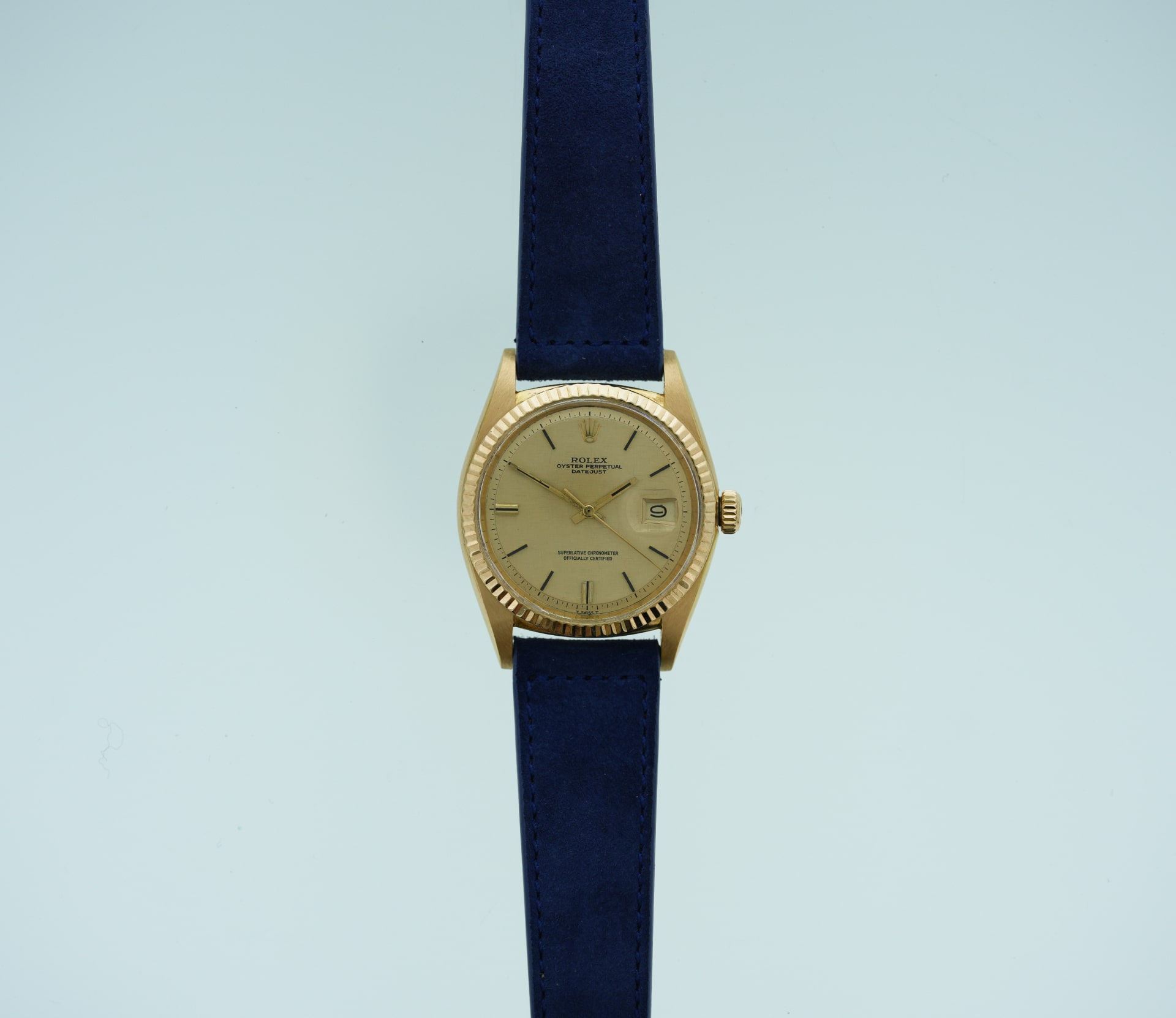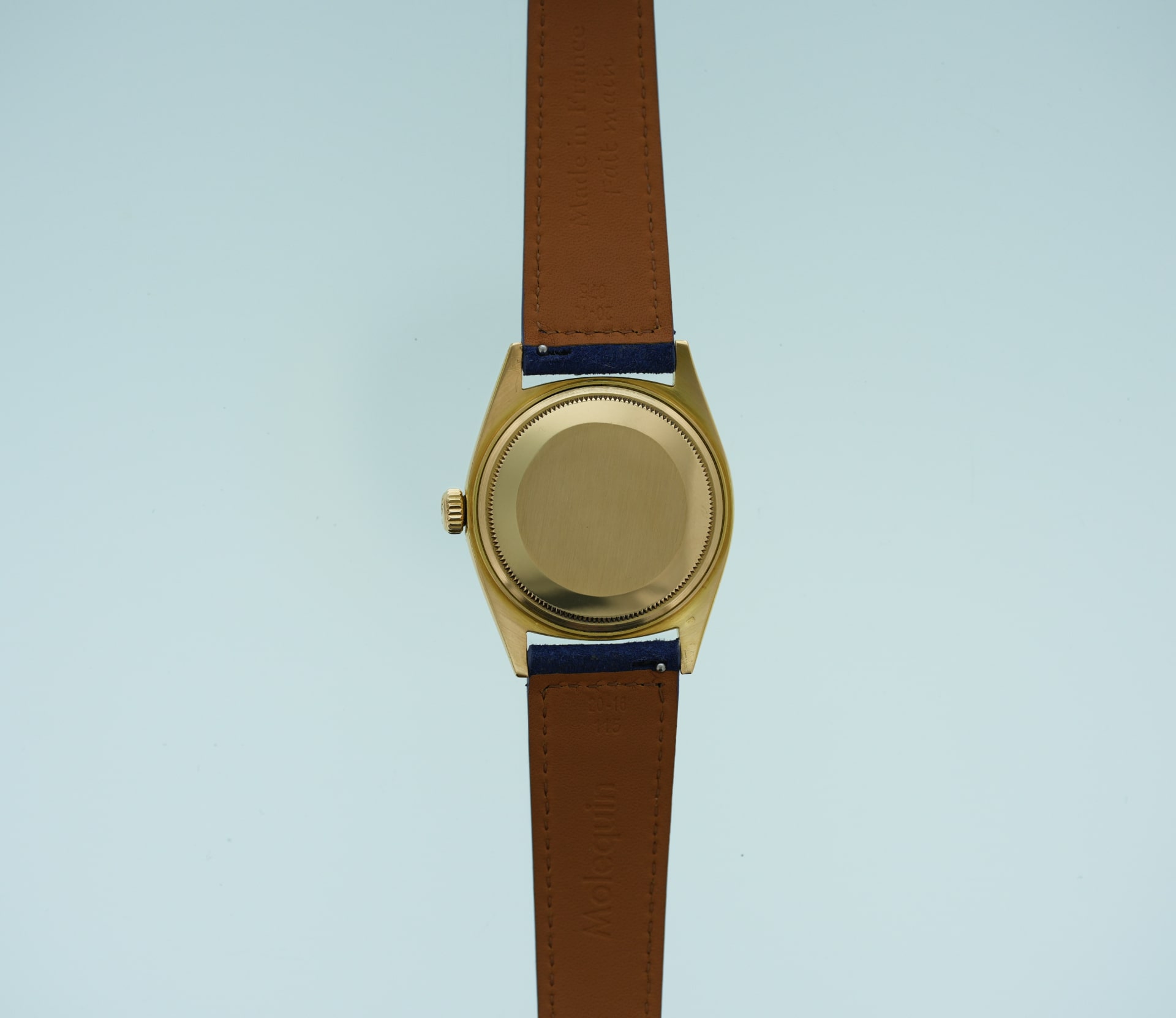 Housed under a plexiglass crystal with a fluted bezel, the watch runs on the robust automatic caliber 1570. Paired with a deep blue leather strap with a Rolex buckle, this example delivers refined contrast and a hint of discreet luxury. A striking piece for both collectors and connoisseurs of vintage elegance.