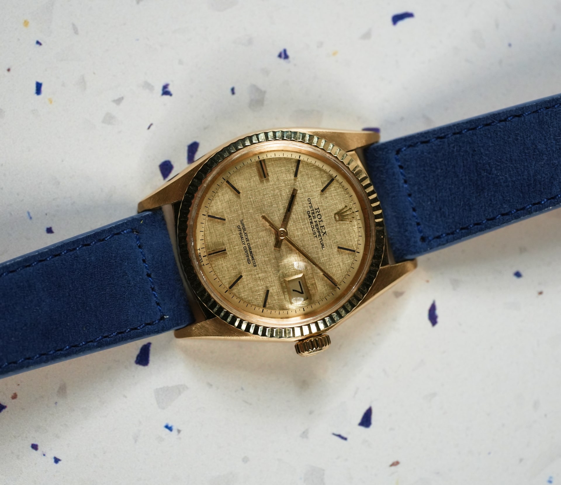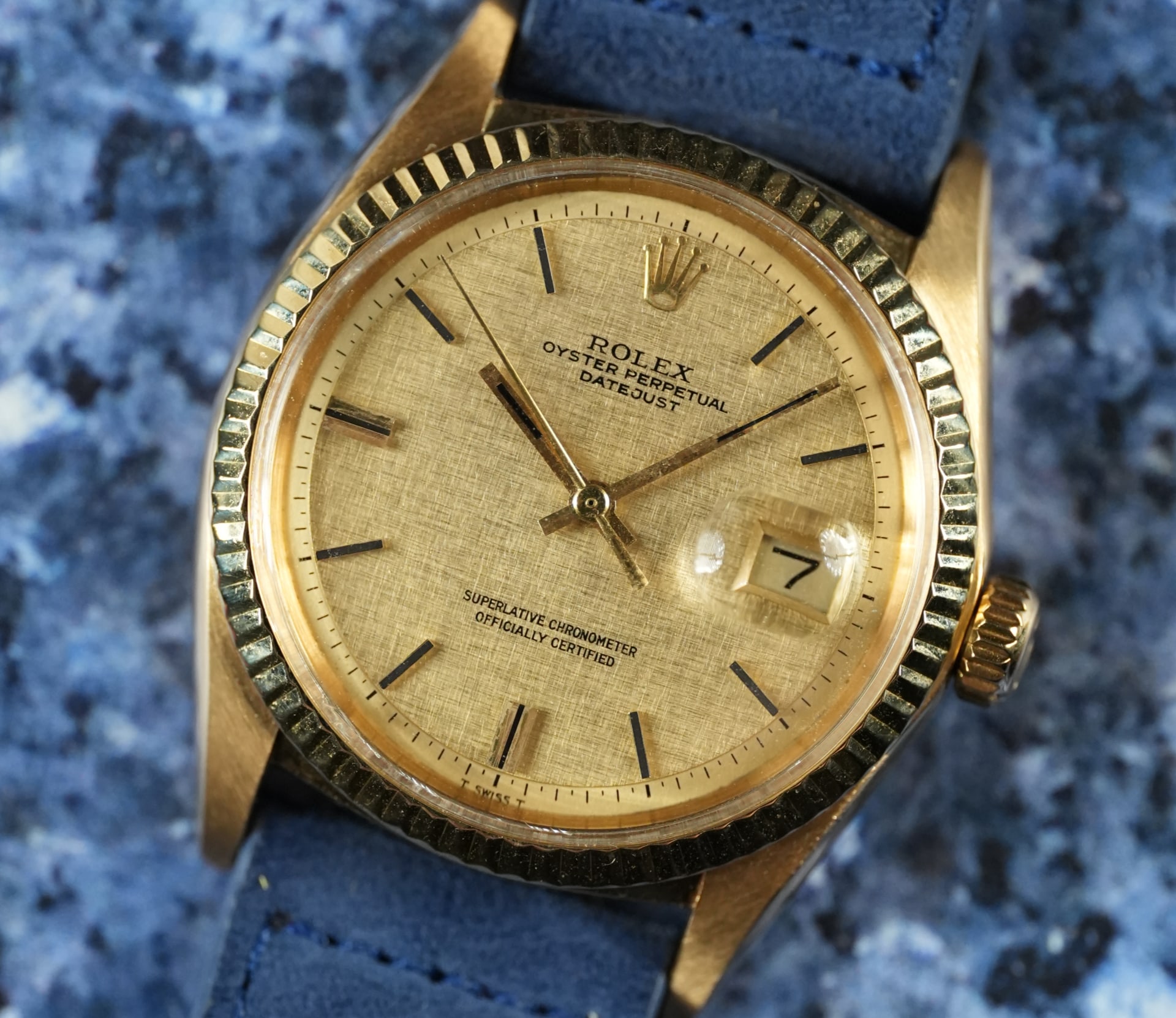 A classic vintage configuration of the Datejust line – this ref. 1601/8 from 1968 comes in solid 18k yellow gold and features the sought-after linen-textured champagne dial. The dial is a non-lume version, adding to its clean and timeless appearance.