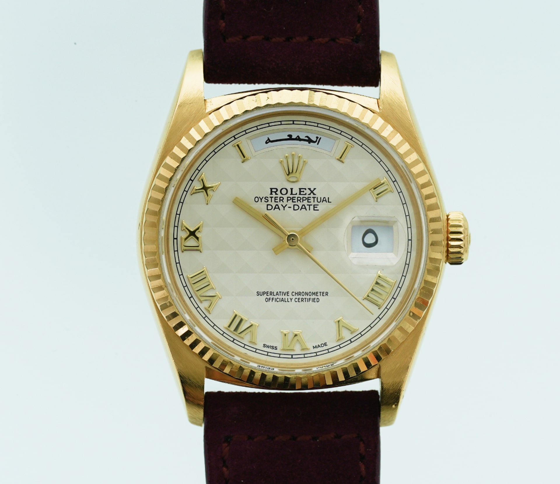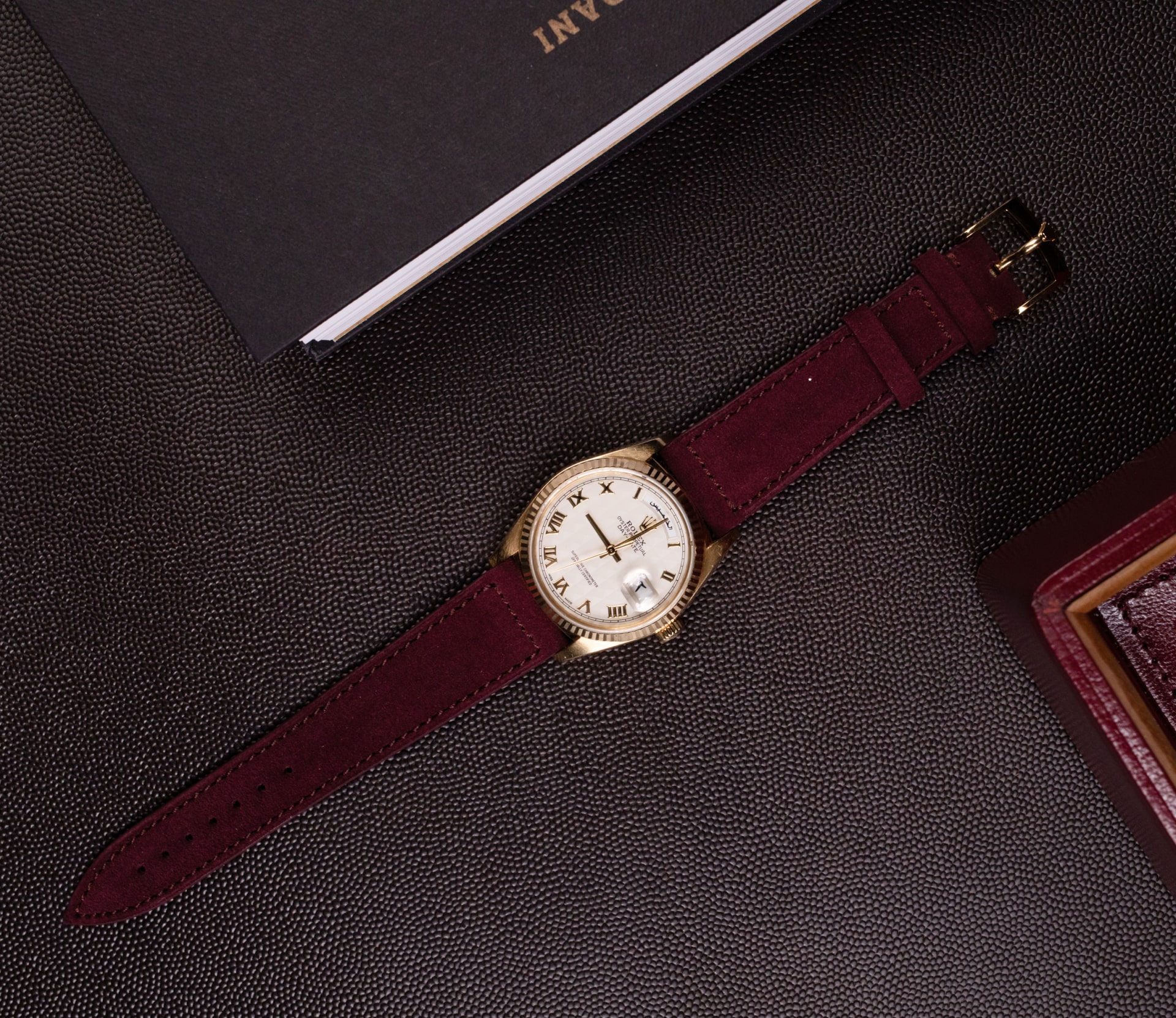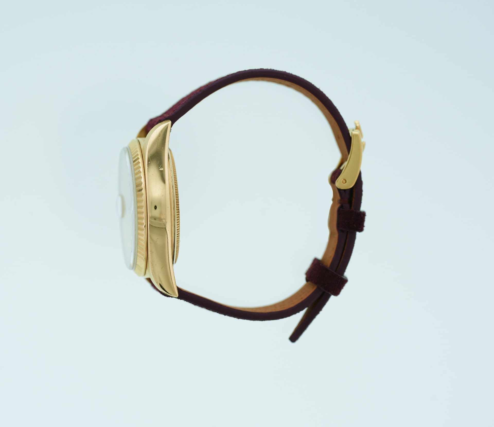 It wears with effortless refinement: the 36 mm case slips under a cuff, yet has real presence in yellow gold. Delivered on a burgundy 20 mm suede strap with original Rolex 18k gold tang buckle, and accompanied by a brown vintage Rolex box (no papers).