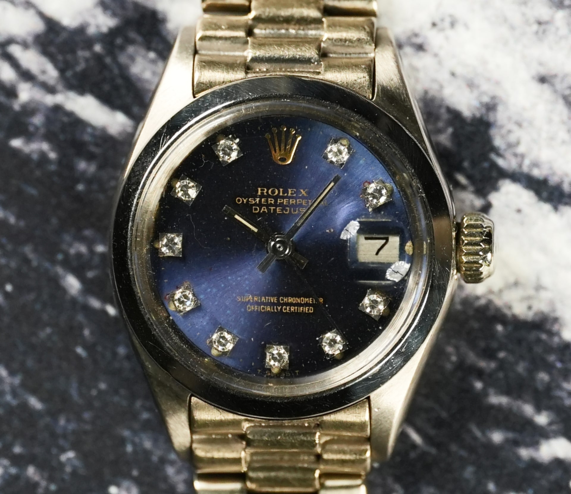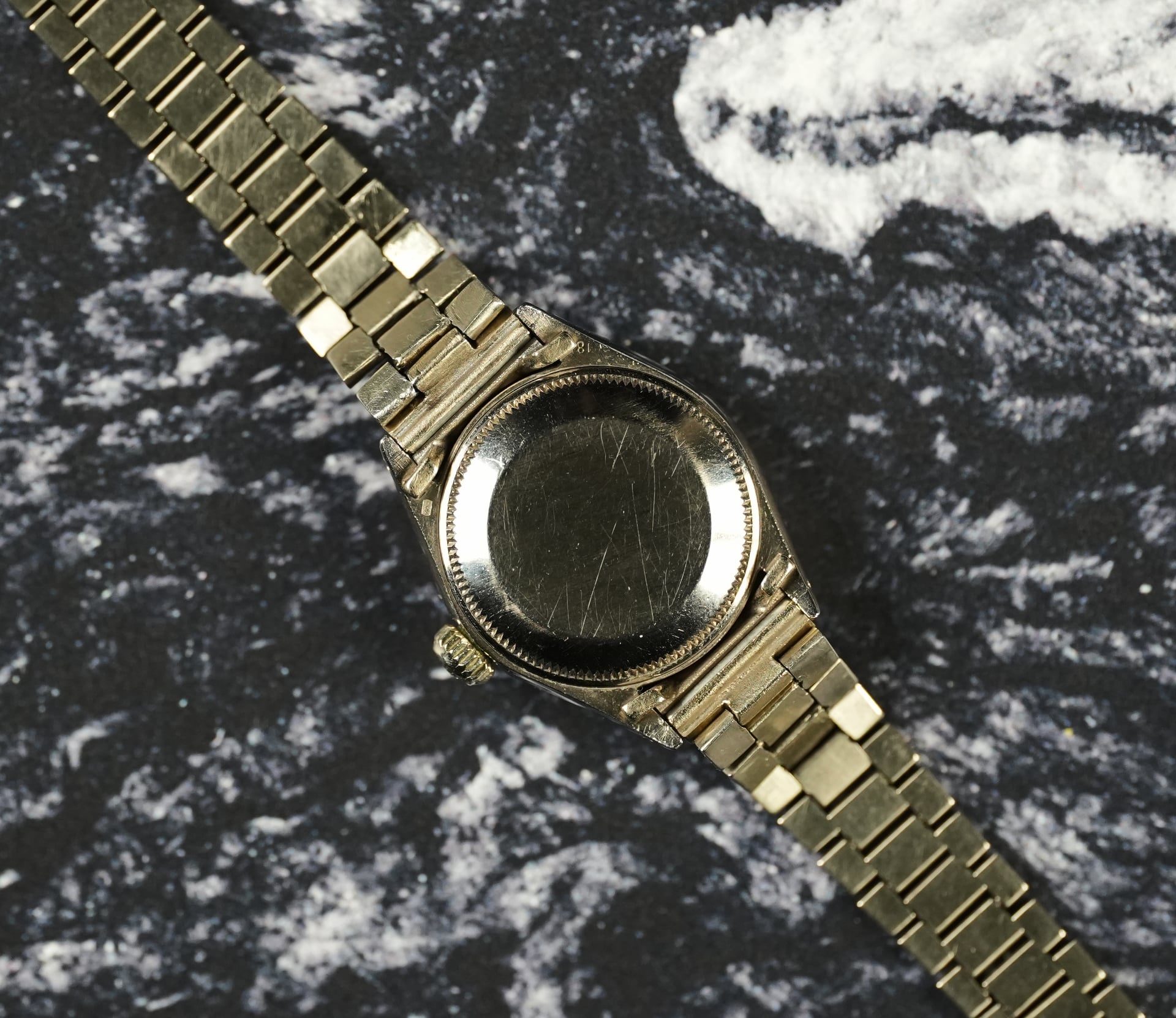 By the 1970s the Lady-Datejust had settled into the 26 mm format with an acrylic crystal and the trademark date magnifier—elegant proportions designed for daily wear. Within that era, the 69xx references could be ordered with the President bracelet, borrowing the discreet luxury of the Day-Date.