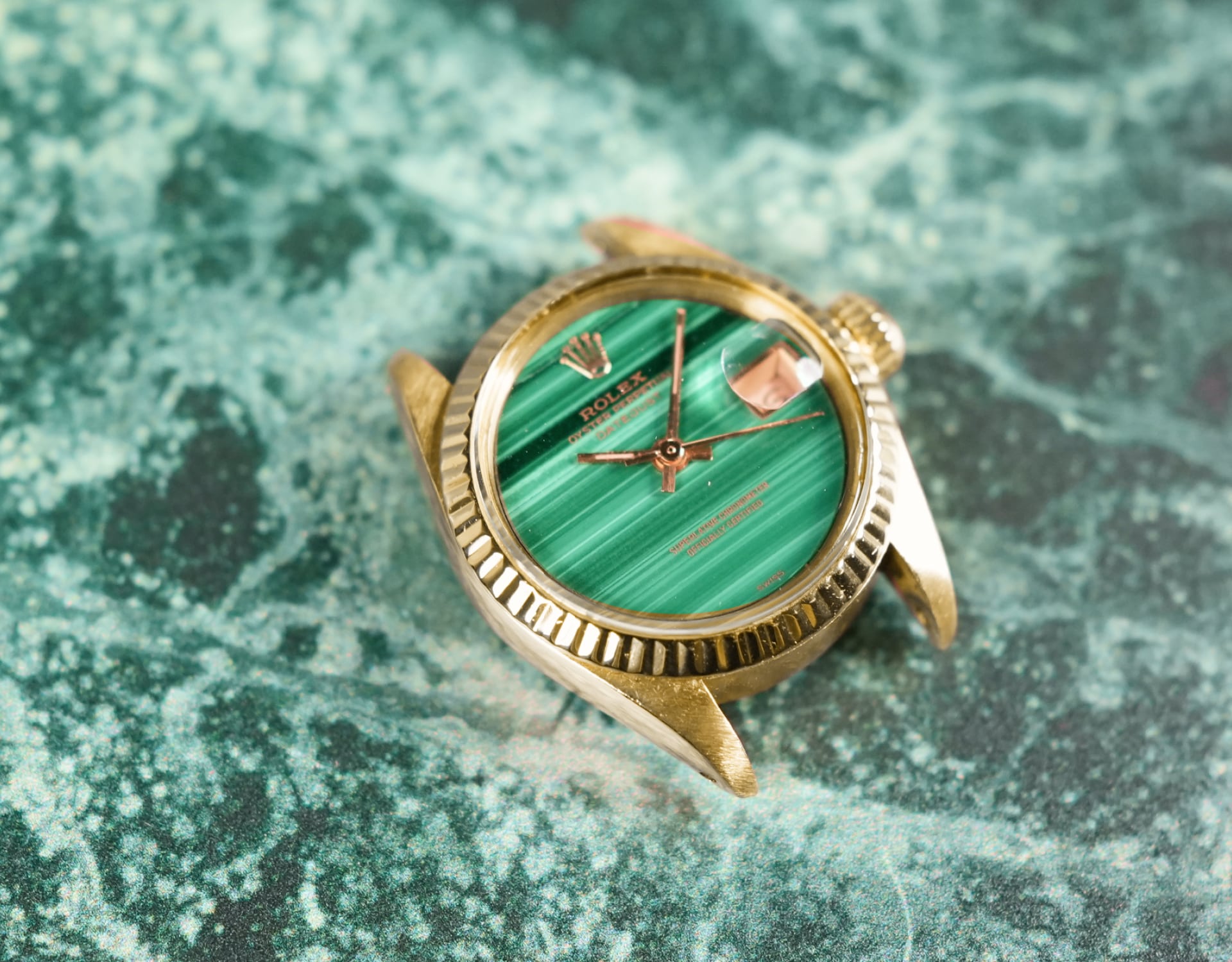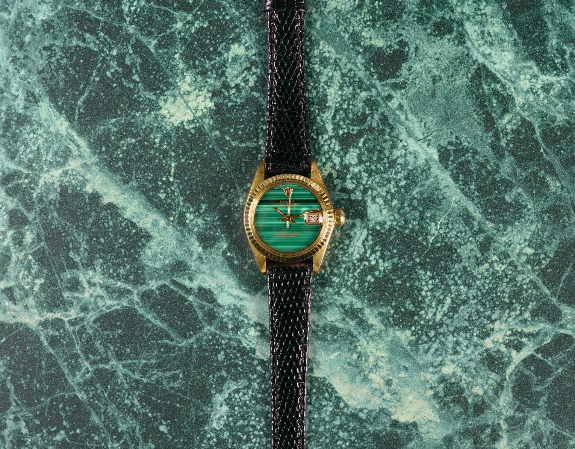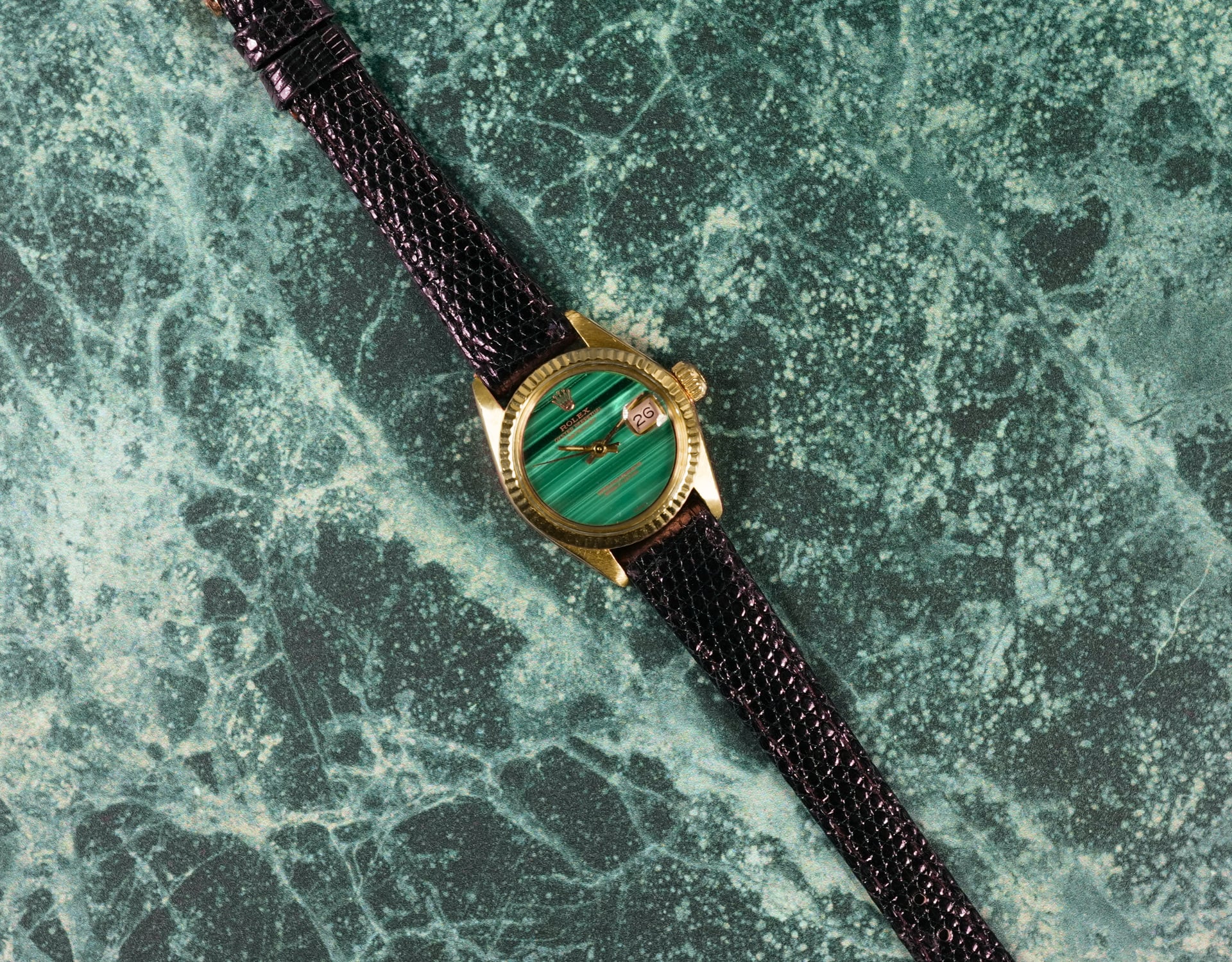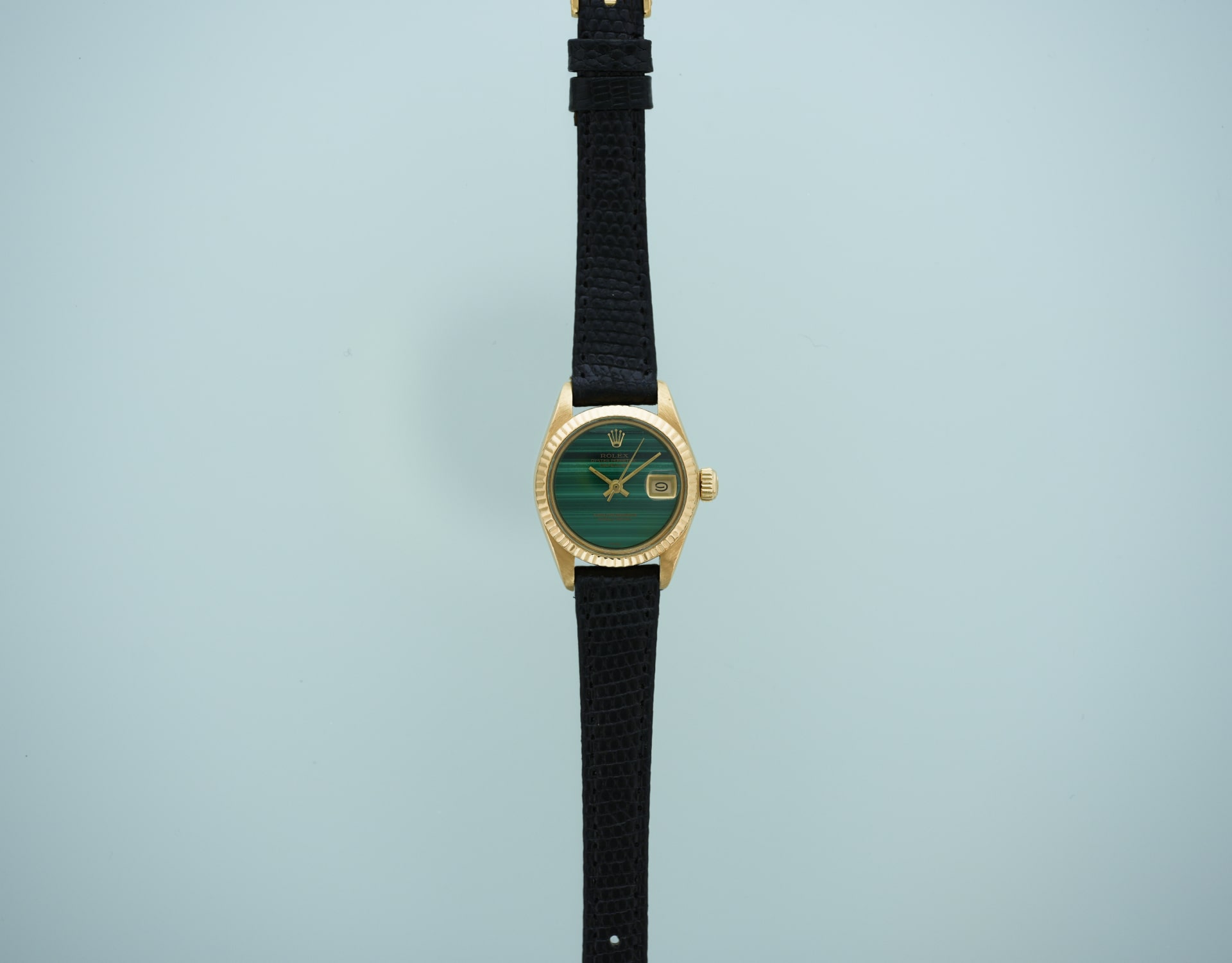 Rolex Lady-Datejust ref. 6917/8 in 18k yellow gold, circa 1980 (serial 6326xxx). Created as the compact sibling of the Datejust, the Lady-Datejust embraced hard-stone dials in the late 1970s–1980s. This example features the uncommon malachite dial, a fluted bezel and plexiglass in the classic 26 mm case.
