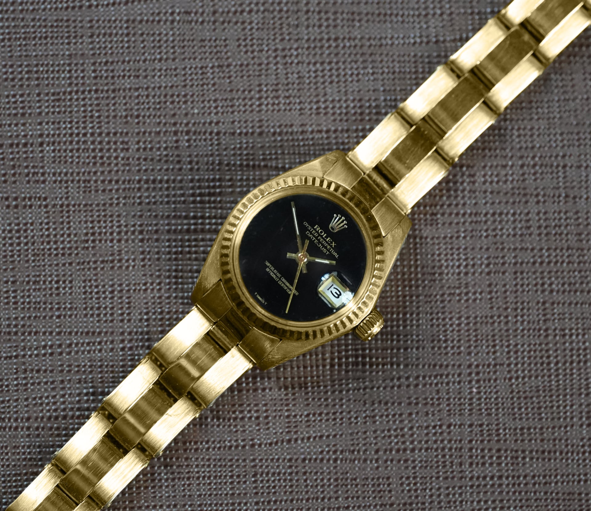 Rolex Lady-Datejust ref. 6917/8 in 18k yellow gold, late-1970s/early-1980s. The Lady-Datejust continued the Datejust concept in a compact 26 mm format; during this era Rolex offered hard-stone dials—here the uncommon onyx dial—paired with a fluted bezel and plexiglass.