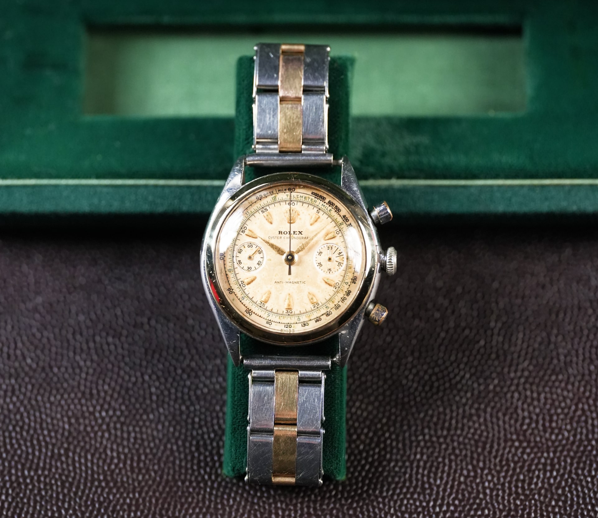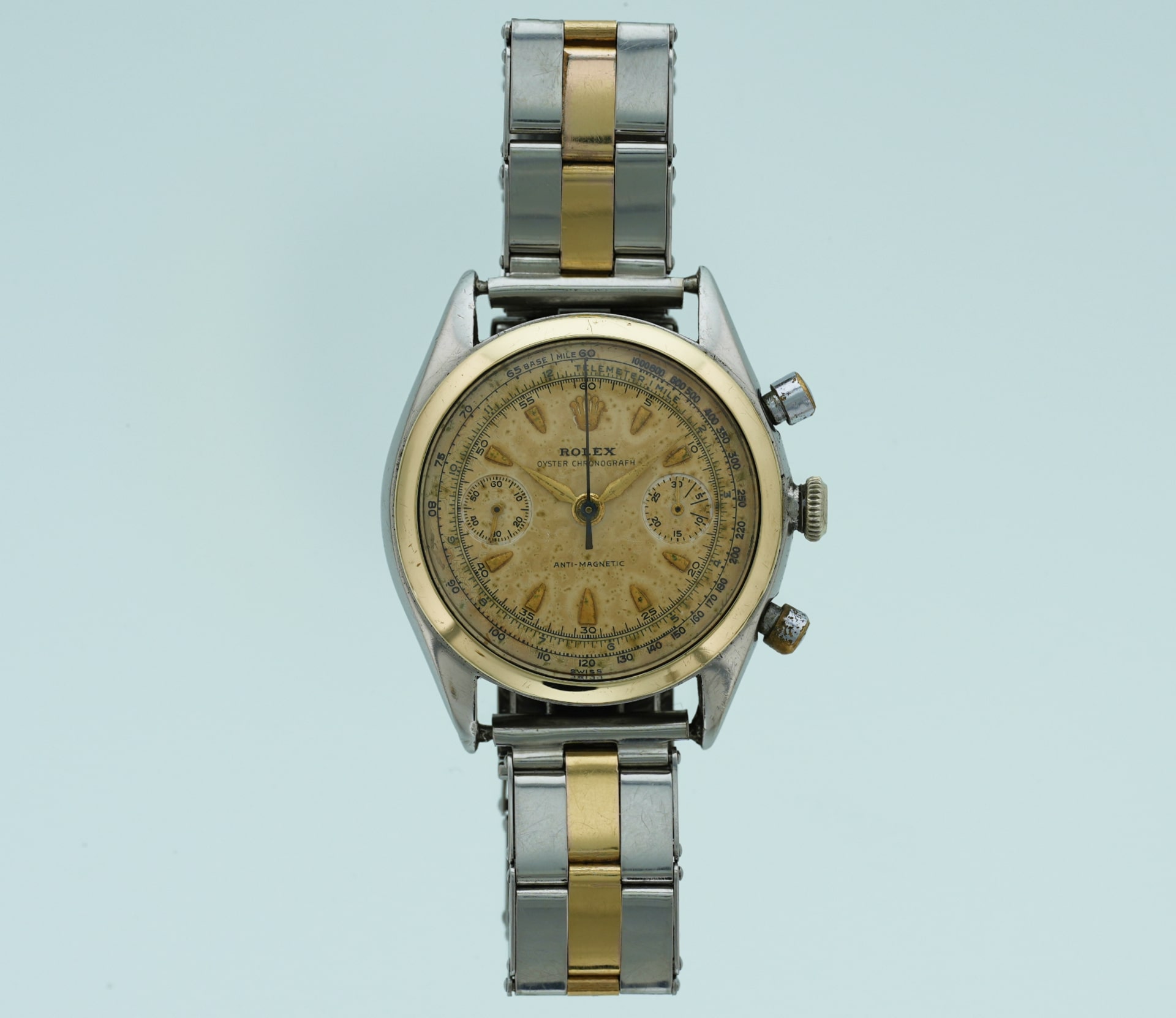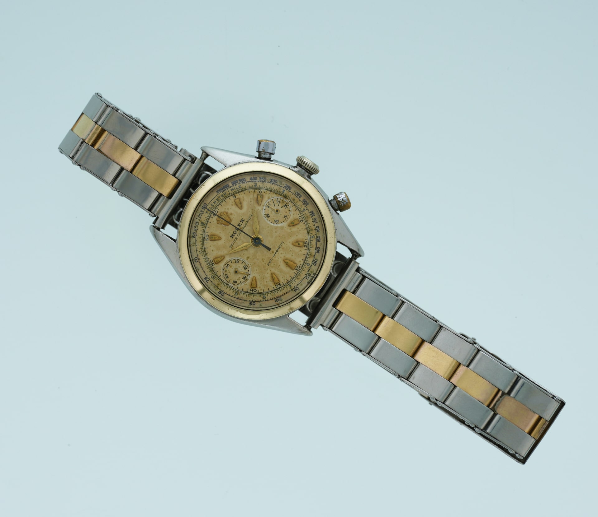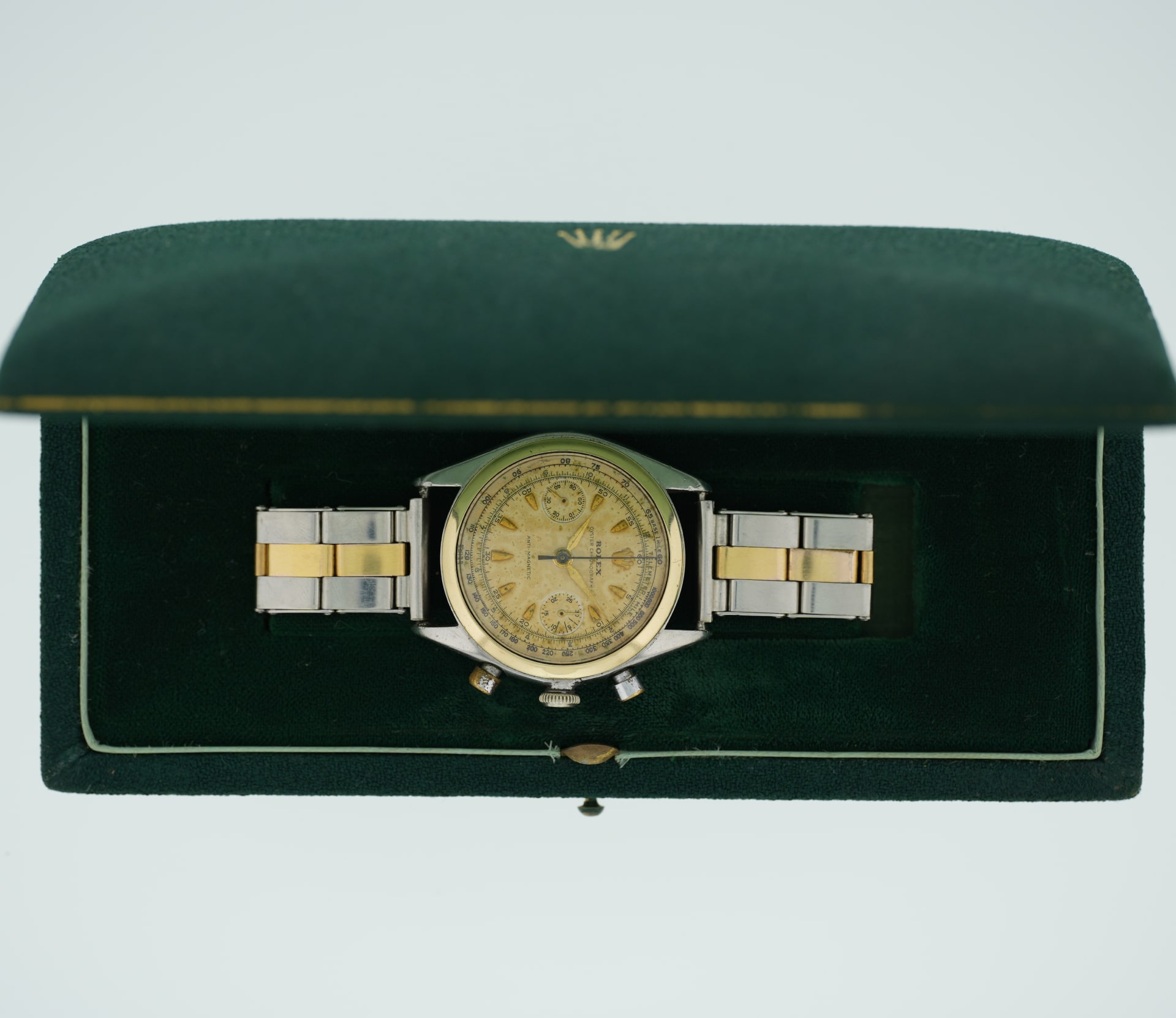 Rolex Oyster Chronograph ref. 4500 “Monoblocco”, circa 1947, in two-tone steel and yellow gold. Historical note: the 4500 belongs to Rolex’s early Oyster Chronograph family of the 1940s, preceding the pre-Daytona 6234/6238 era; Monoblocco denotes the mid-case with integrated bezel milled from a single block.